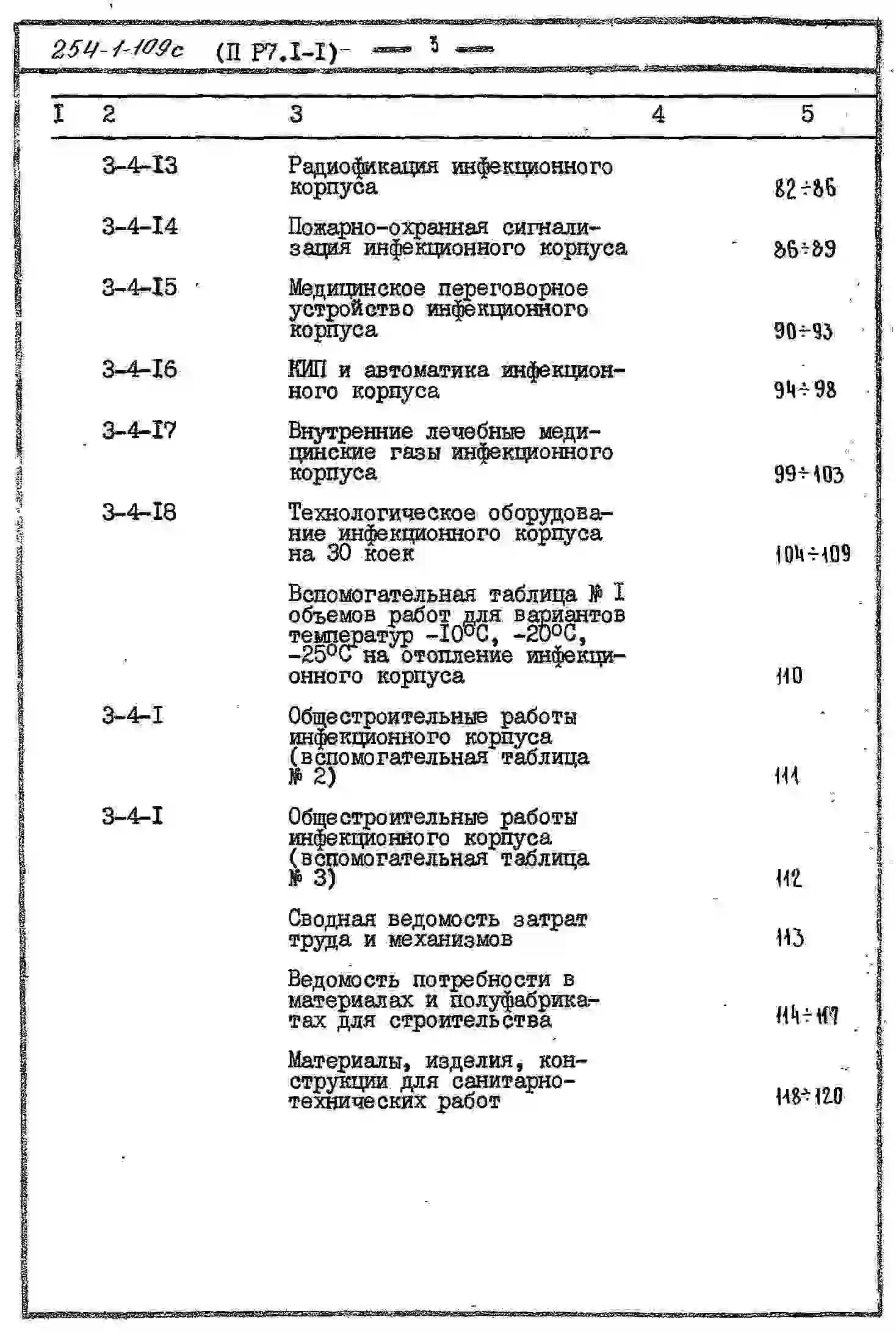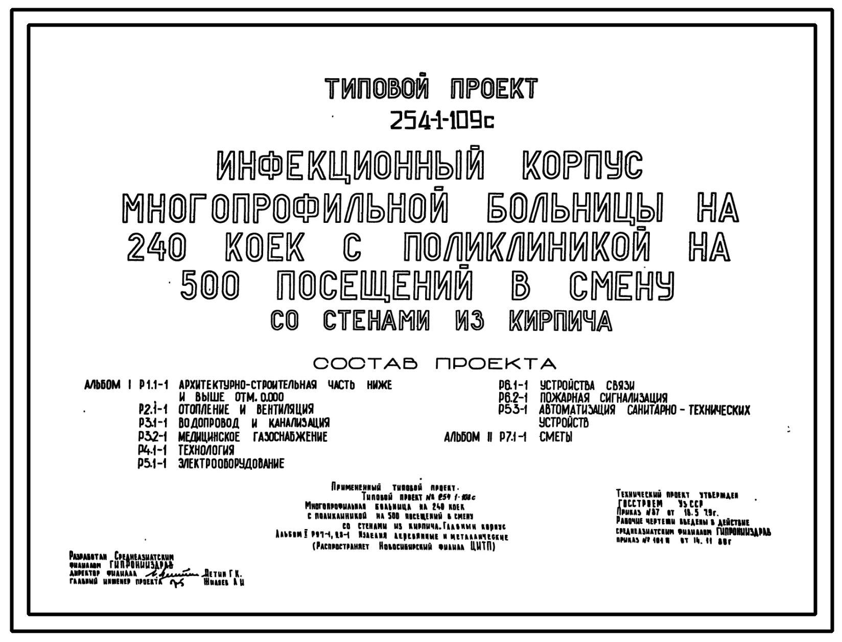Типовой проект 254-1-109с Инфекционный корпус многопрофильной больницы на 240 коек с поликлиникой на 500 посещений в смену. Сейсмичность 7, 8 баллов. Здание одноэтажное. Стены из кирпича.