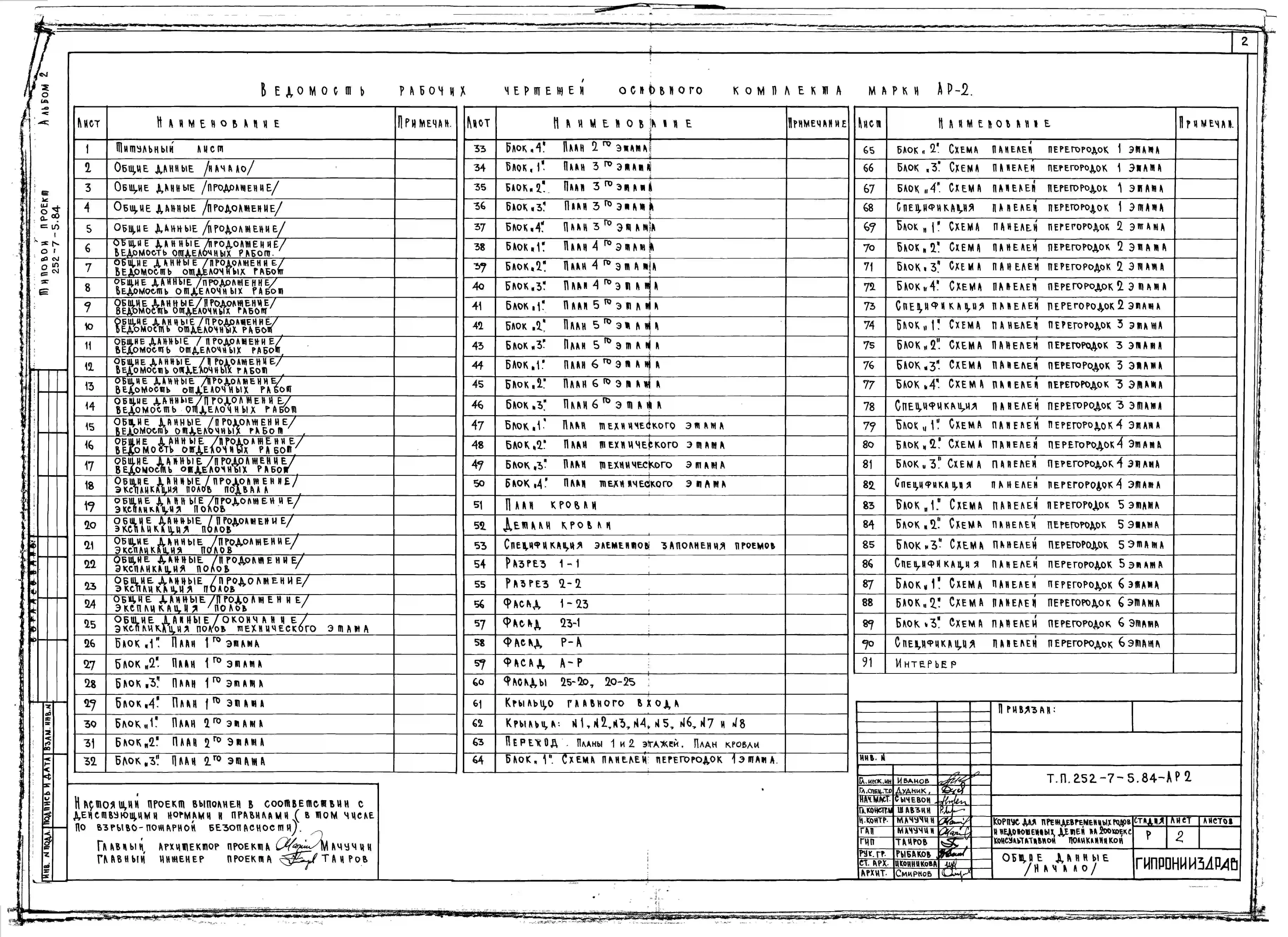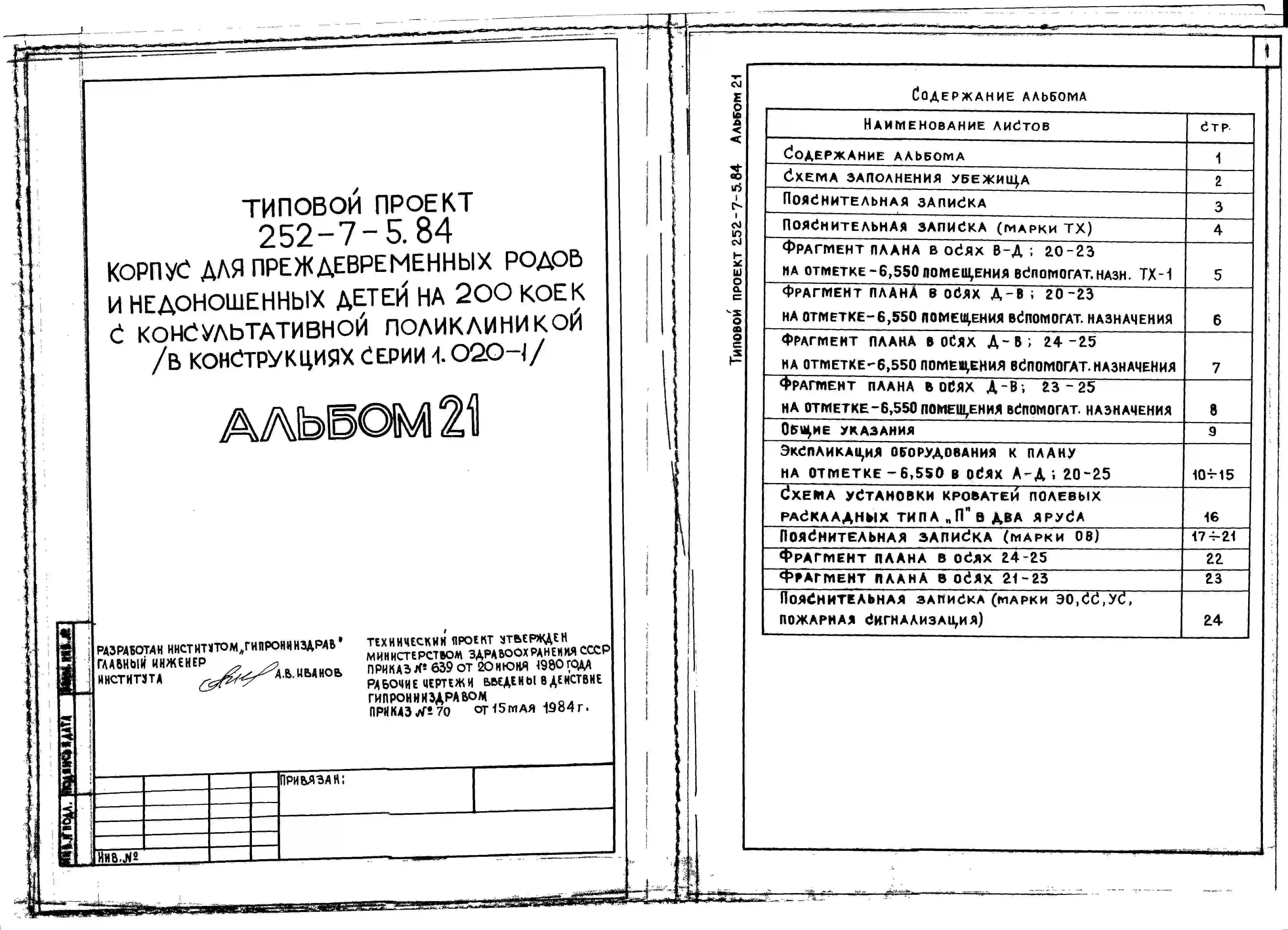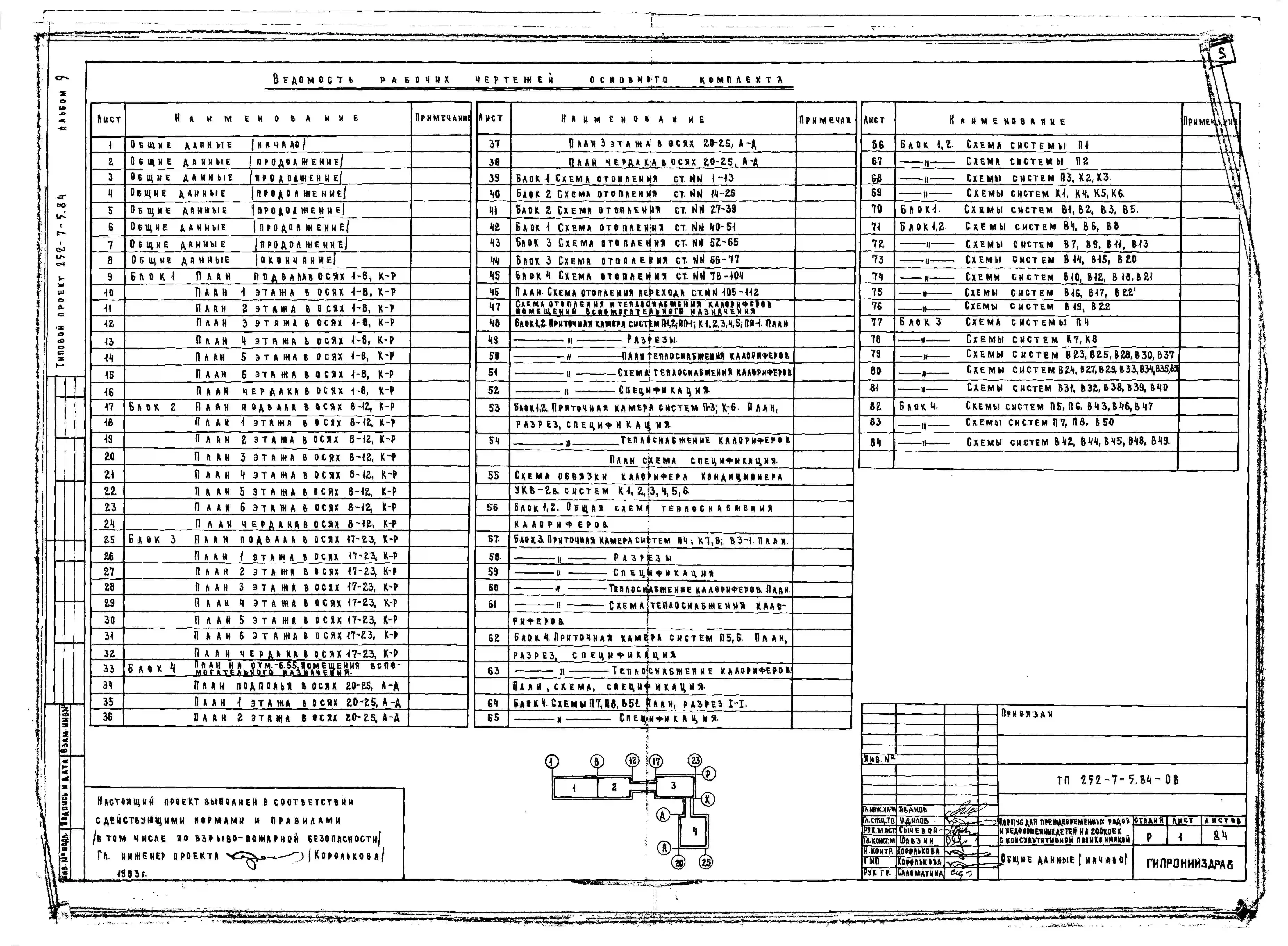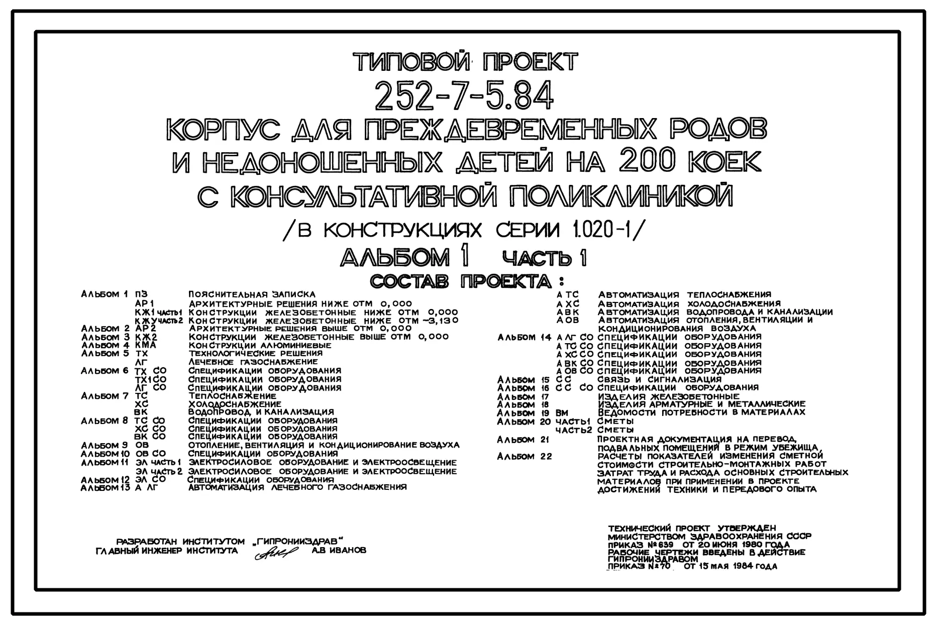 Типовой проект 252-7-5.84 Корпус для преждевременных родов и недоношенных детей на 200 коек с консультативной поликлиникой. Здание двух-, четырех-, семиэтажное. Каркас сборный железобетонный серии 1.020.-1. Стены из однослойных легкобетонных панелей.