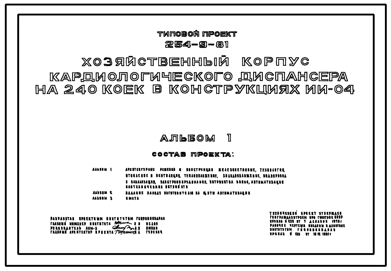 Типовой проект 254-9-81 Хозяйственный корпус кардиологического диспансера на 240 коек. Здание одно-, двухэтажное. Стены из кирпича.