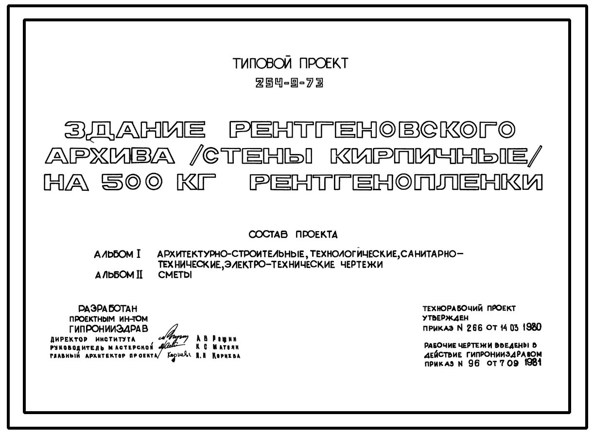Типовой проект 254-9-73 Здание рентгеновского архива на 500 кг рентгенопленки. Здание одноэтажное. Стены из кирпича.