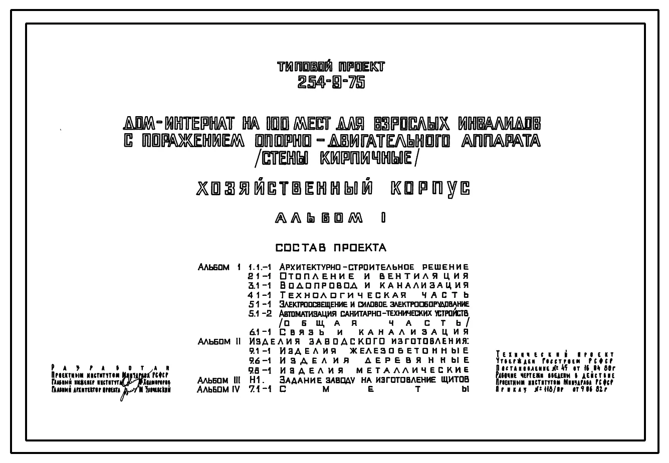 Типовой проект 254-9-75 Хозяйственный корпус дома-интерната на 100 мест для взрослых инвалидов с поражением опорно-двигательного аппарата. Для строительства в 1В климатическом подрайоне, 2 и 3 климатических районах