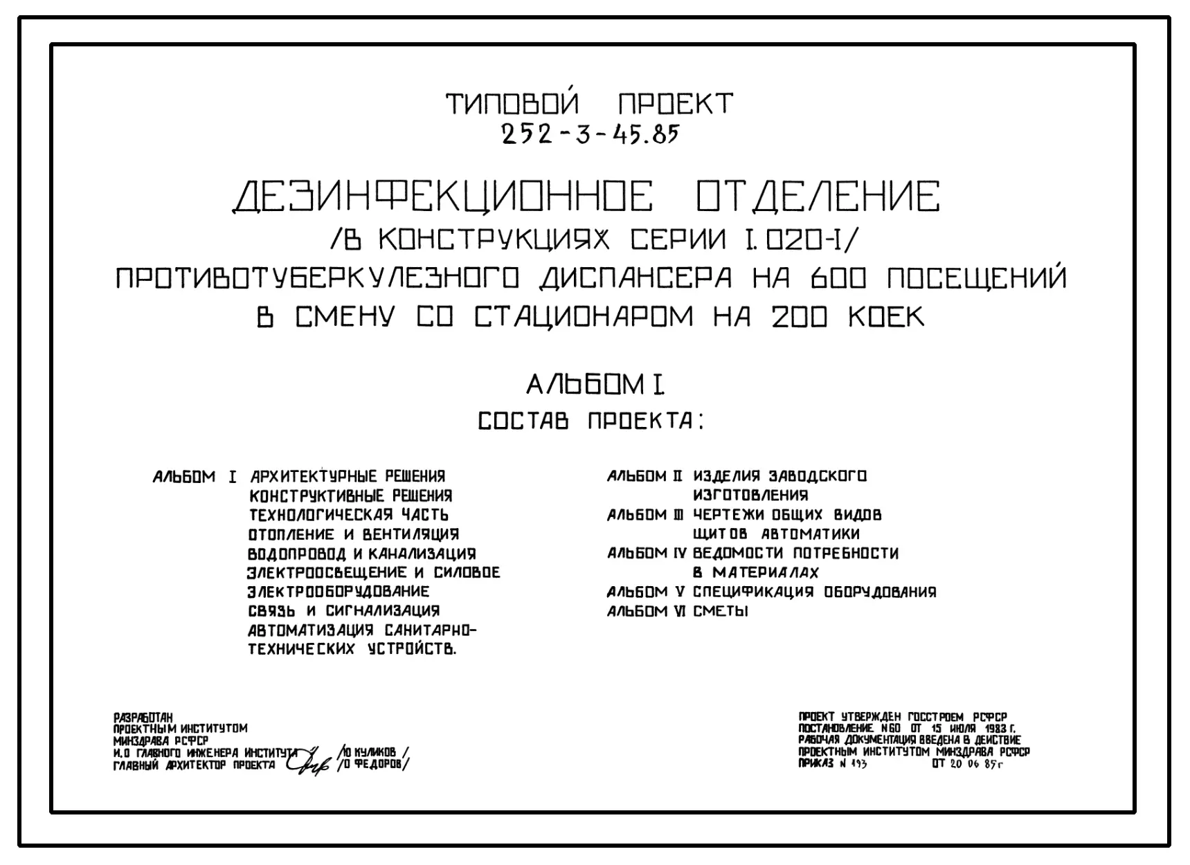 Типовой проект 252-3-45.85 Дезинфекционное отделение противотуберкулёзного диспансера на 600 посещений в смену со стационаром на 200 коек. Здание двухэтажное. Стены из легкобетонных панелей.