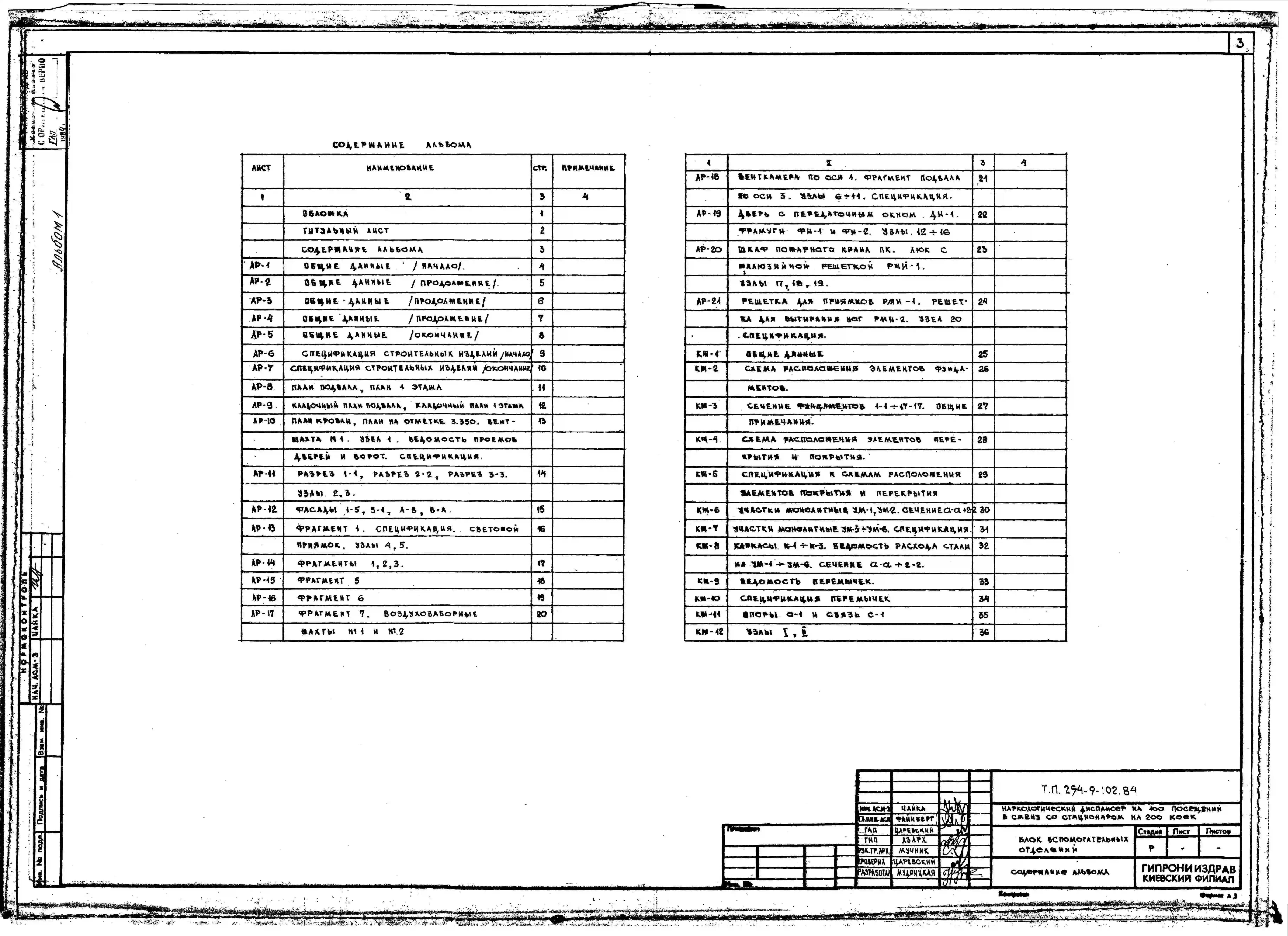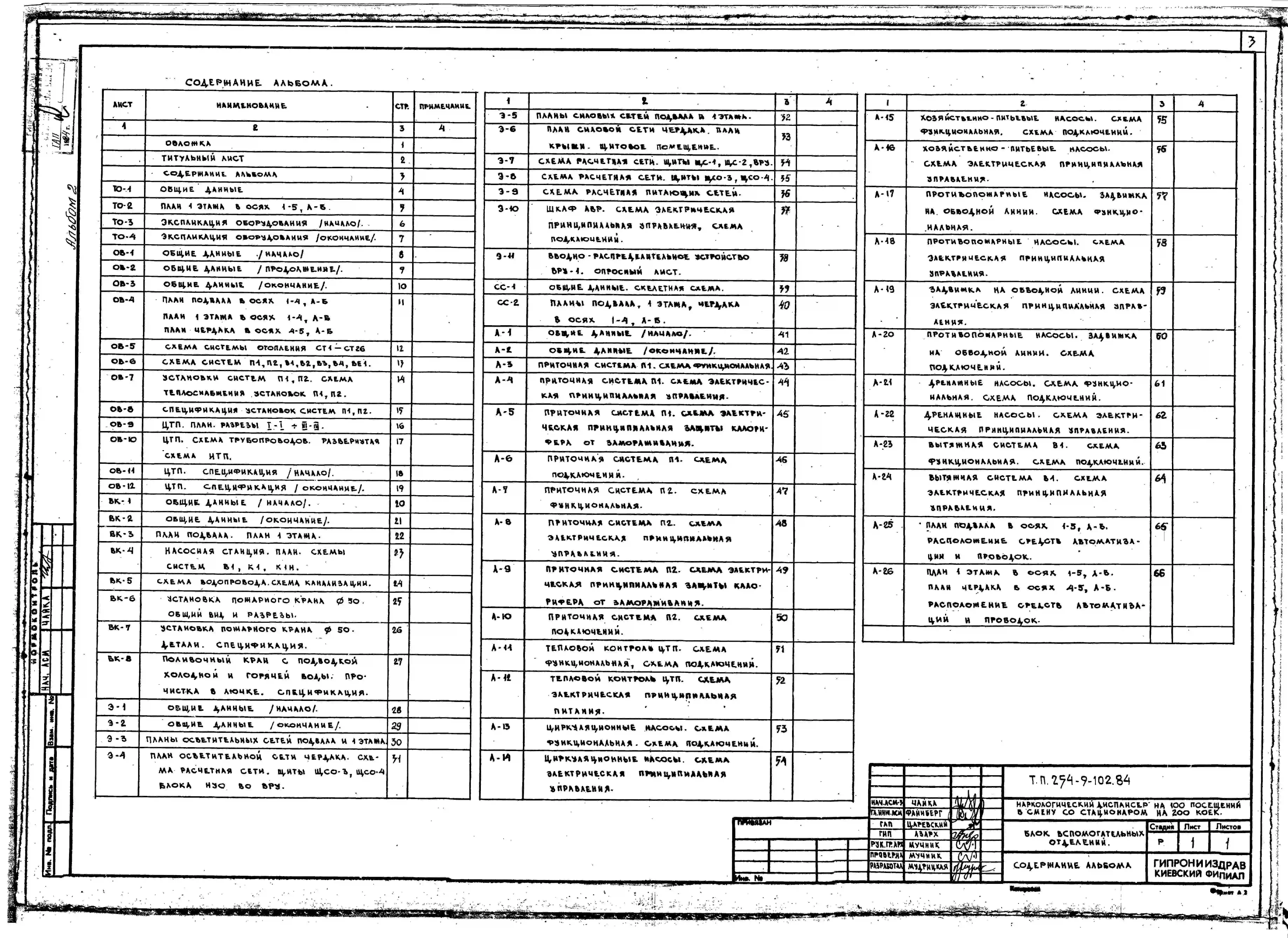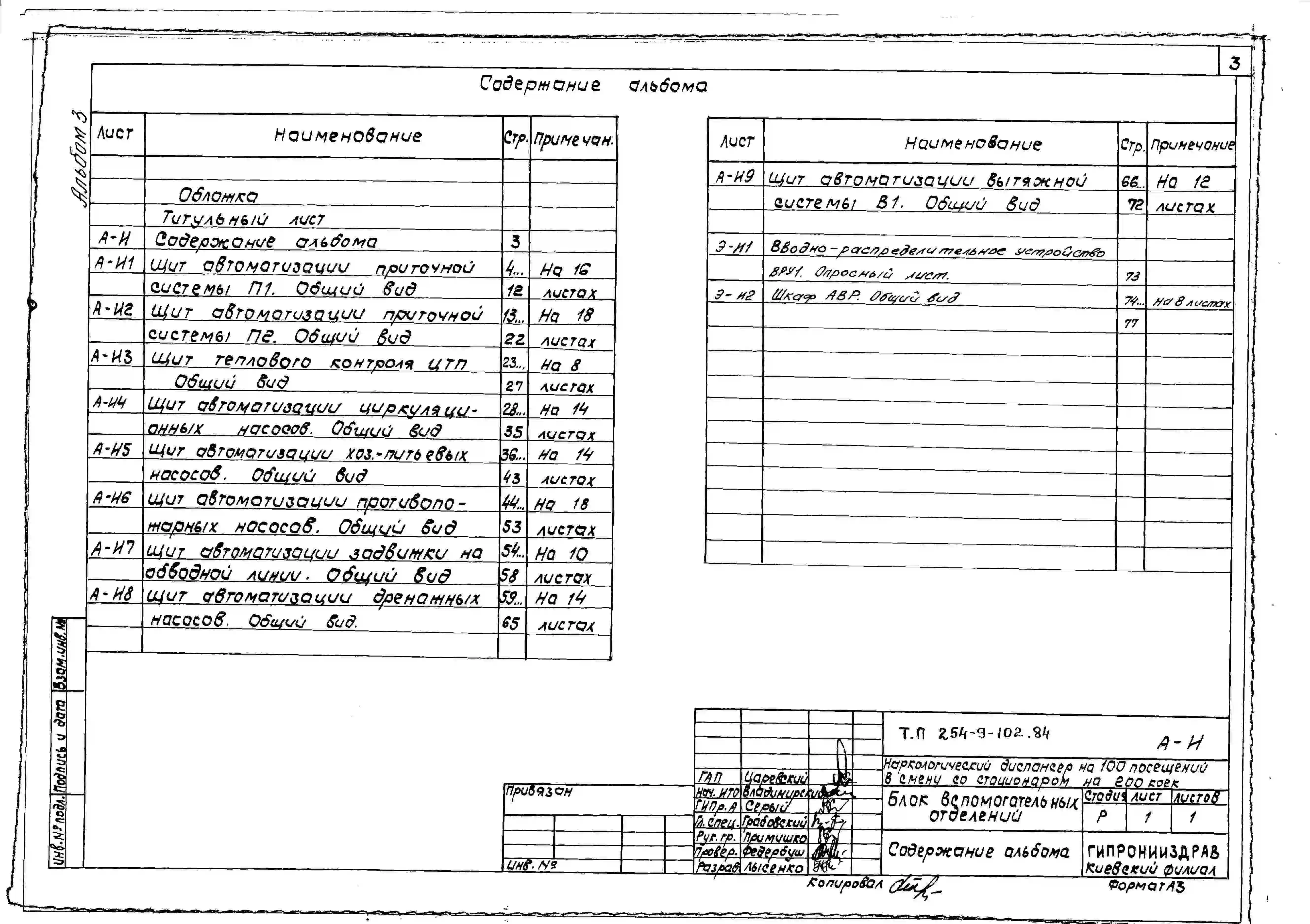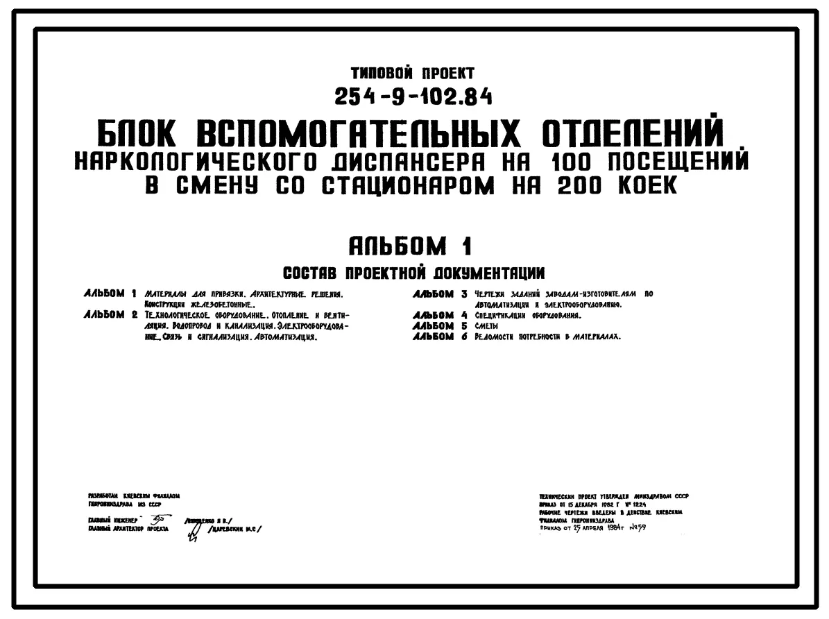 Типовой проект 254-9-102.84 Блок вспомогательных отделений наркологического диспансера на 100 посещений в смену со стационаром на 200 коек. Здание одноэтажное. Стены из кирпича.