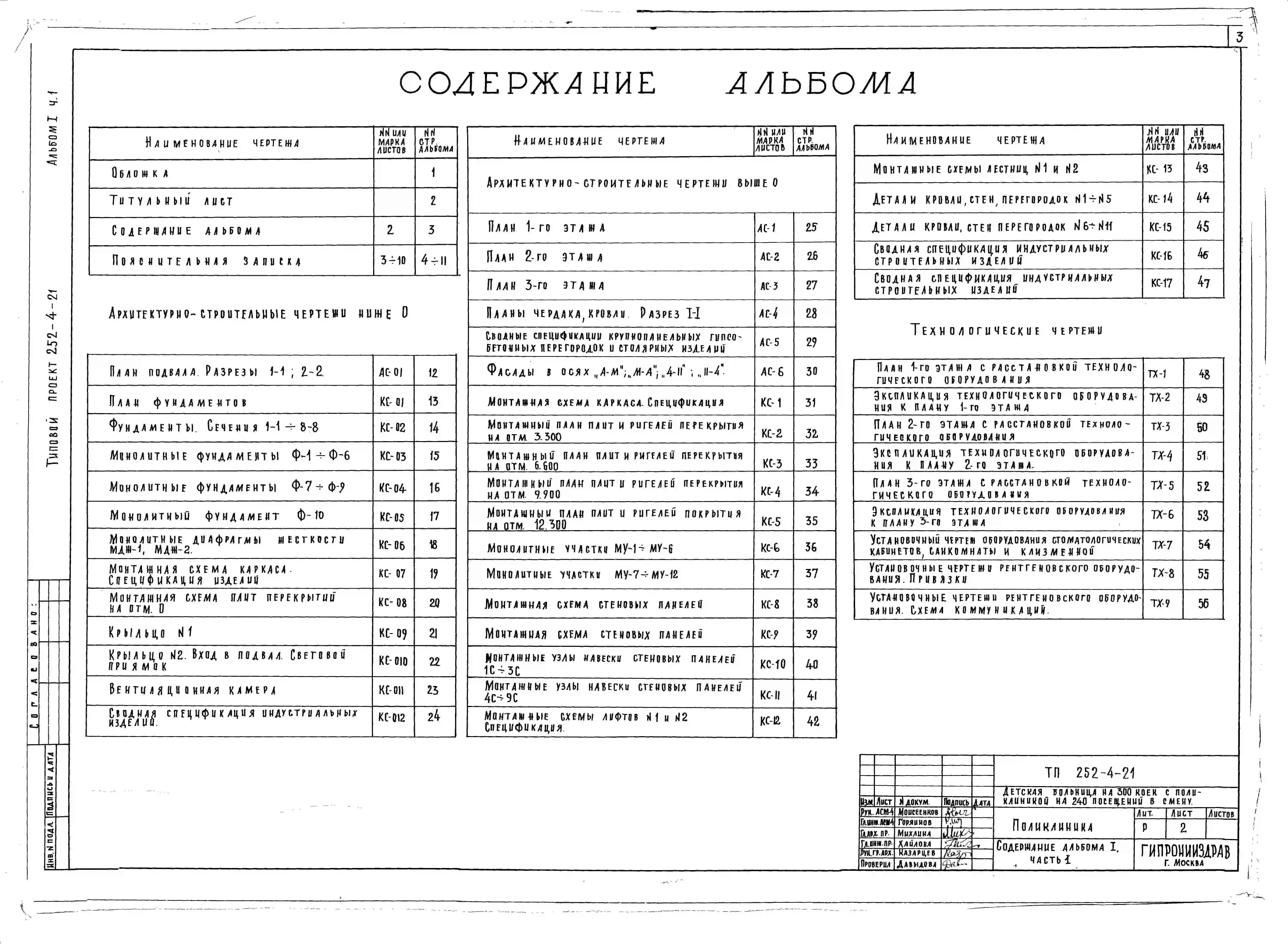 Типовой проект 252-4-21 Поликлиника на 240 посещений в смену детской больницы на 300 коек. Здание трёхэтажное. Каркас сборный железобетонный серии ИИ-04. Стены из керамзитобетонных панелей.