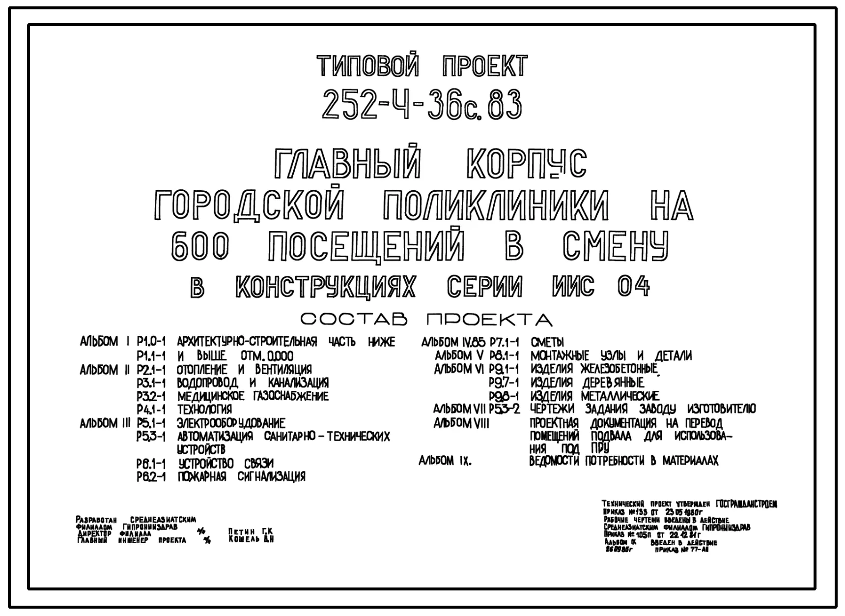 Типовой проект 252-4-36с.83 Городская поликлиника на 600 посещений в смену. Сейсмичность 7,8,9 баллов. Здание одно-, пятиэтажное. Каркас сборный железобетонный серии ИИС-04. Стены из легкобетонных панелей.