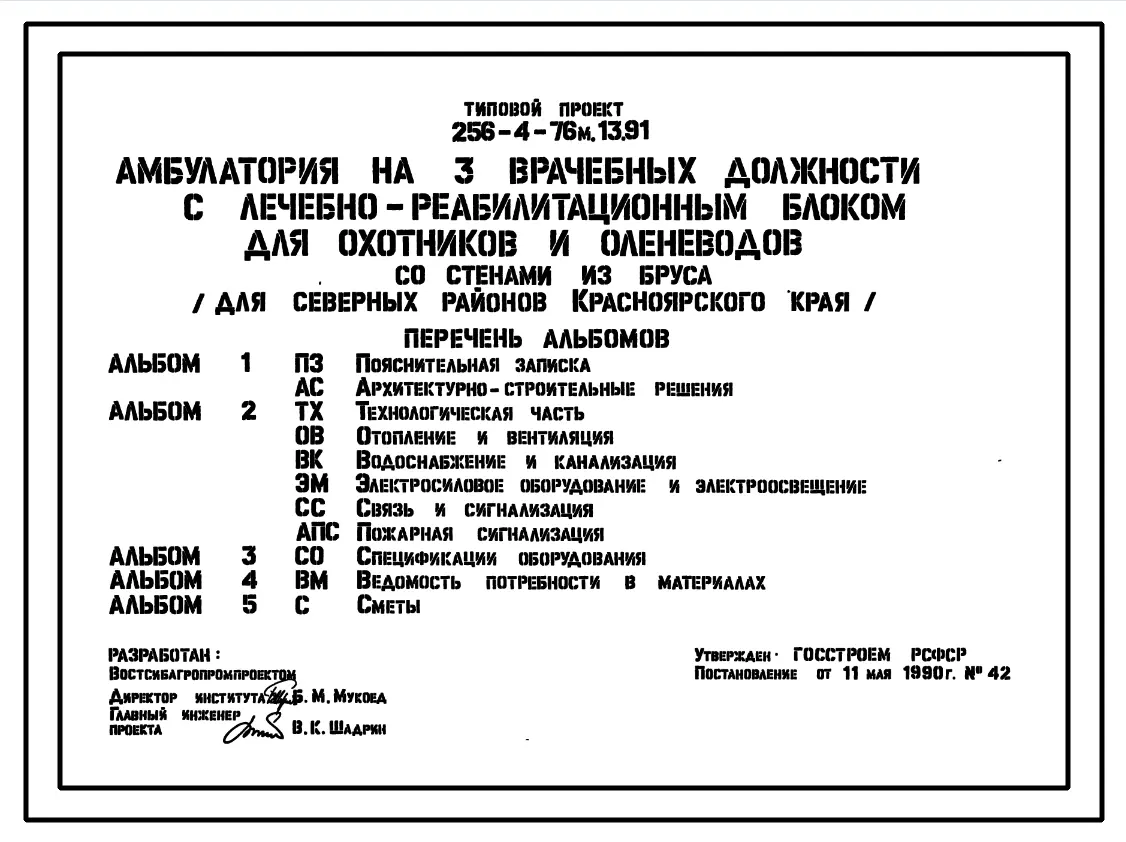 Типовой проект 256-4-76м.13.91 Амбулатория на 3 врачебных должности с лечебно-реабилитационным блоком для охотников и оленеводов. Для северных районов Красноярского края. Грунты вечномерзлые. Здание двухэтажное. Стены из бруса.