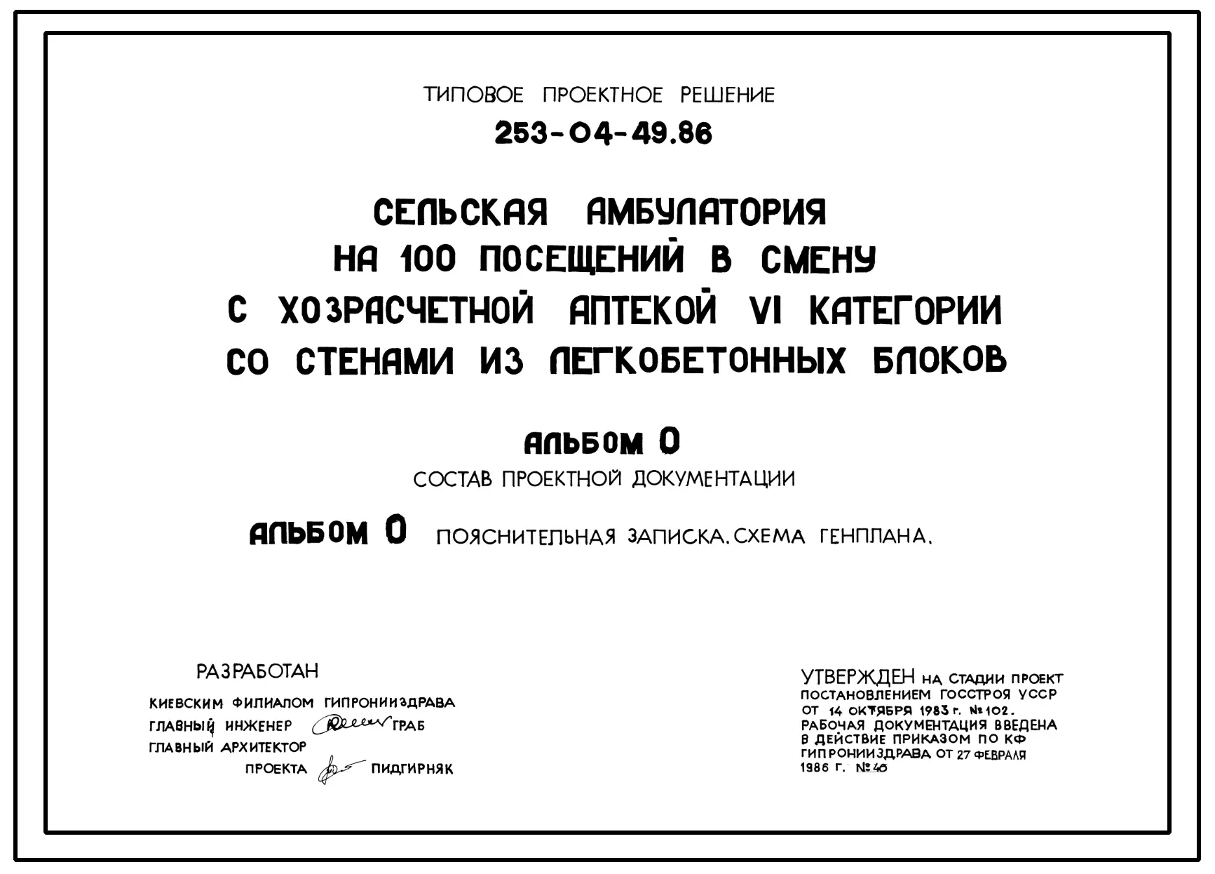 Типовой проект 253-04-49.86 Сельская амбулатория на 100 посещений в смену с хозрасчетной аптекой VI категории со стенами из легкобетонных блоков