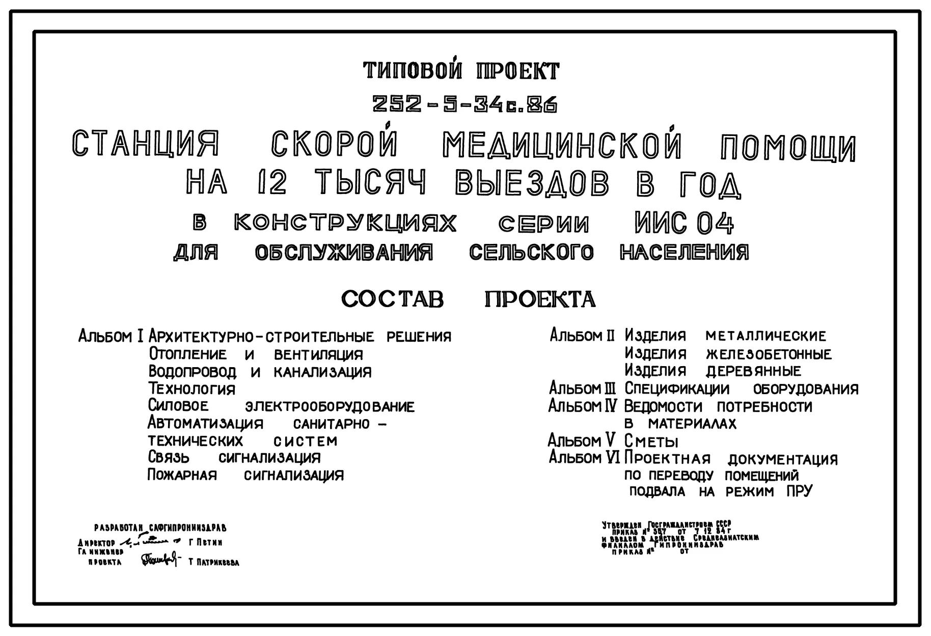 Типовой проект 252-5-34с.86 Станция скорой медицинской помощи для обслуживания сельского населения на 12 тыс. выездом в год. Сейсмичность 8 баллов. Здание одно-, двухэтажное. Конструкции серии ИИС-04. Стены из керамзитобетонных панелей.