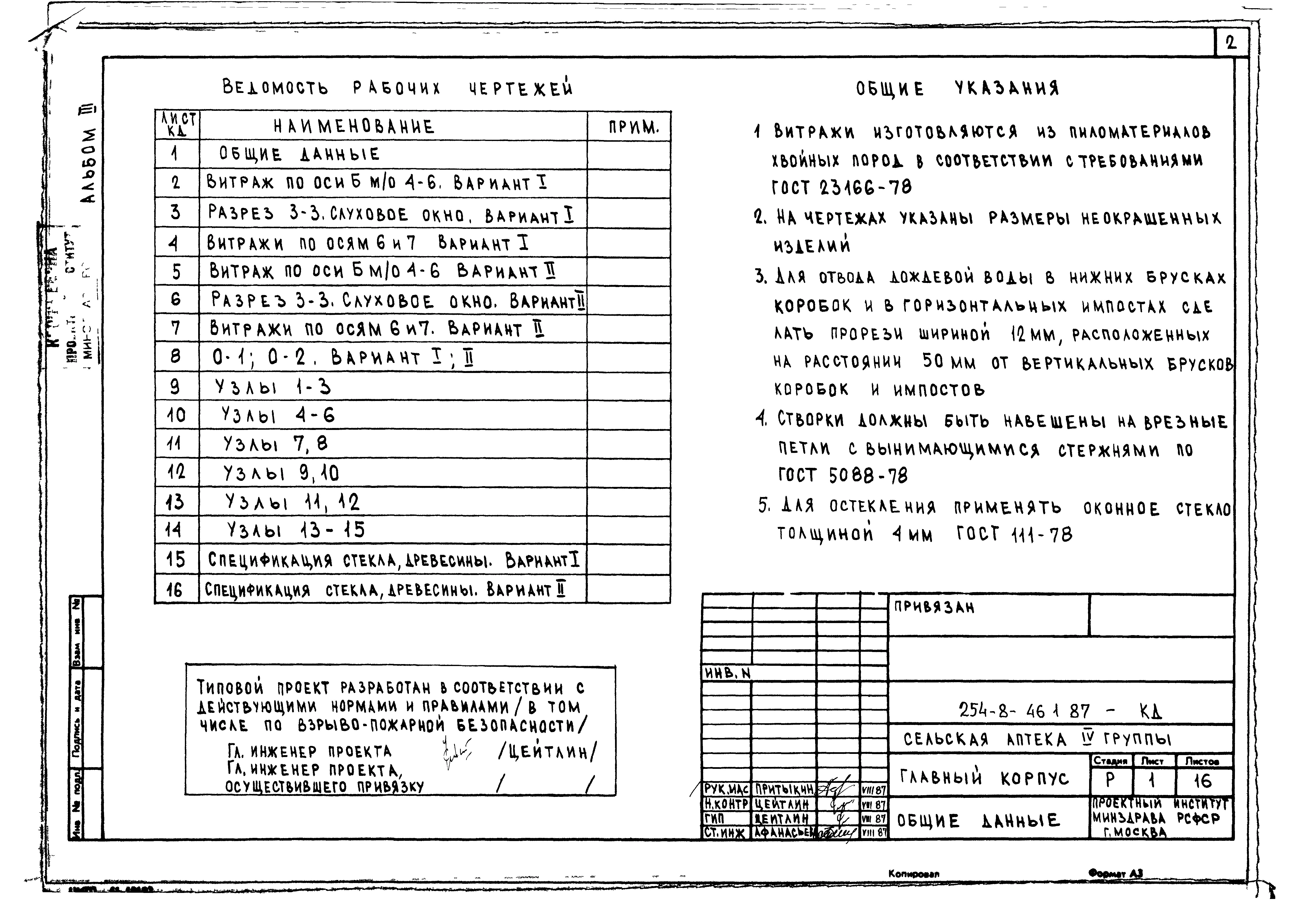 Типовой проект 254-8-46.2.87 Главный корпус сельской аптеки IV группы. Здание одноэтажное. Стены из кирпича. Конструктивные варианты со вспомогательными помещениями в подвале.