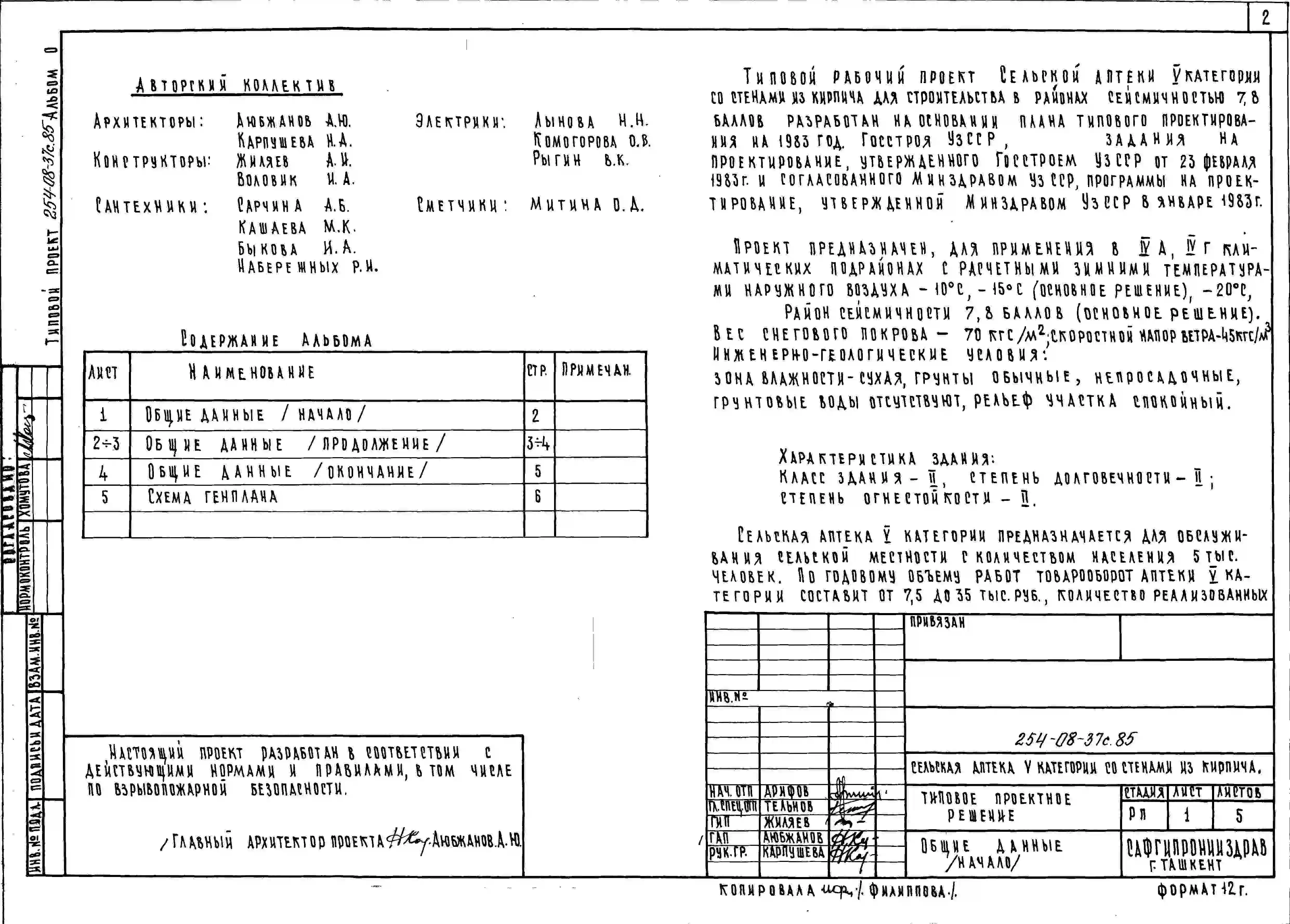 Типовой проект 254-08-37с.85 Сельская аптека 5 категории. Для строительства в 4А и 4Г климатических подрайонах сейсмичностью 7 и 8 баллов