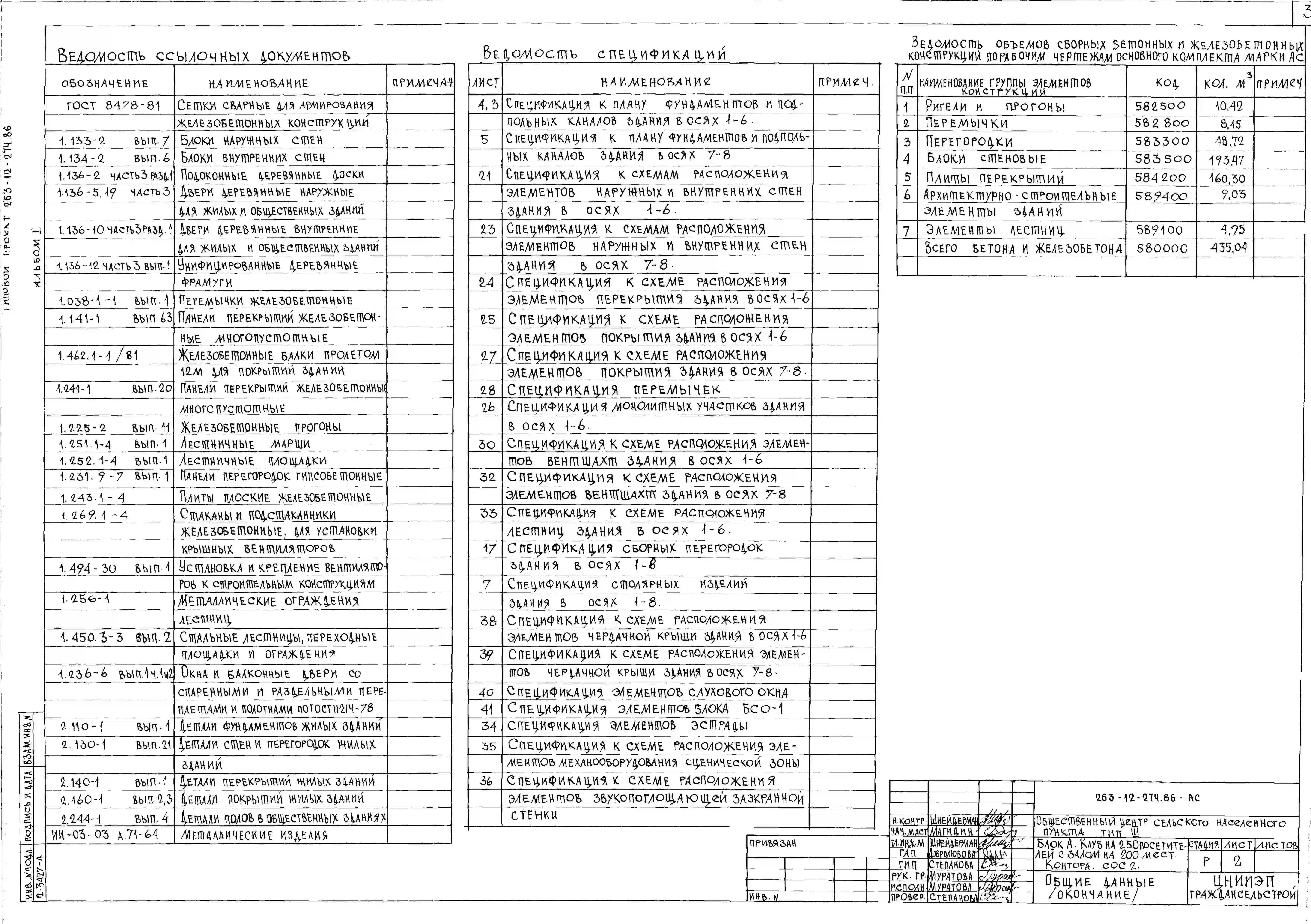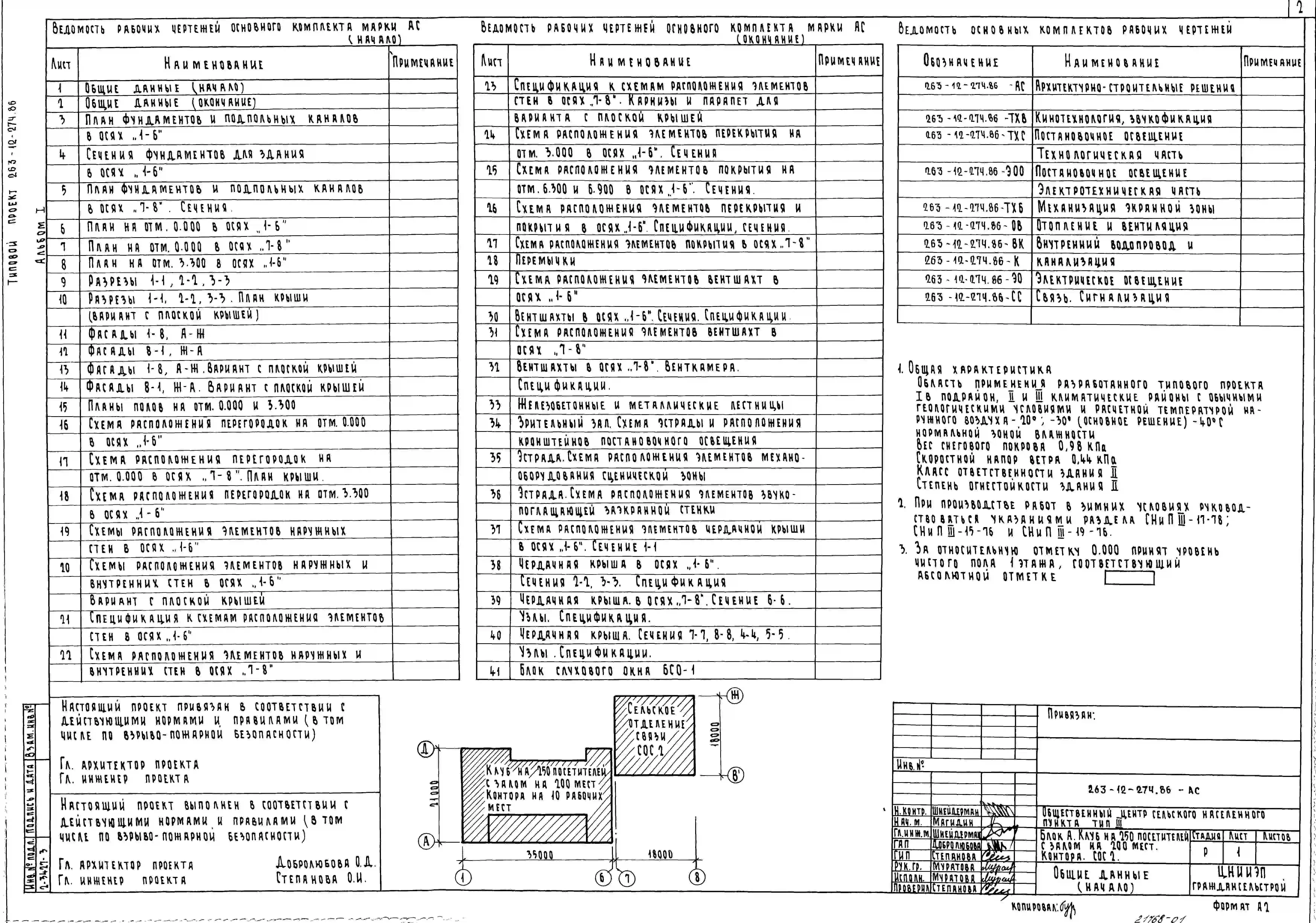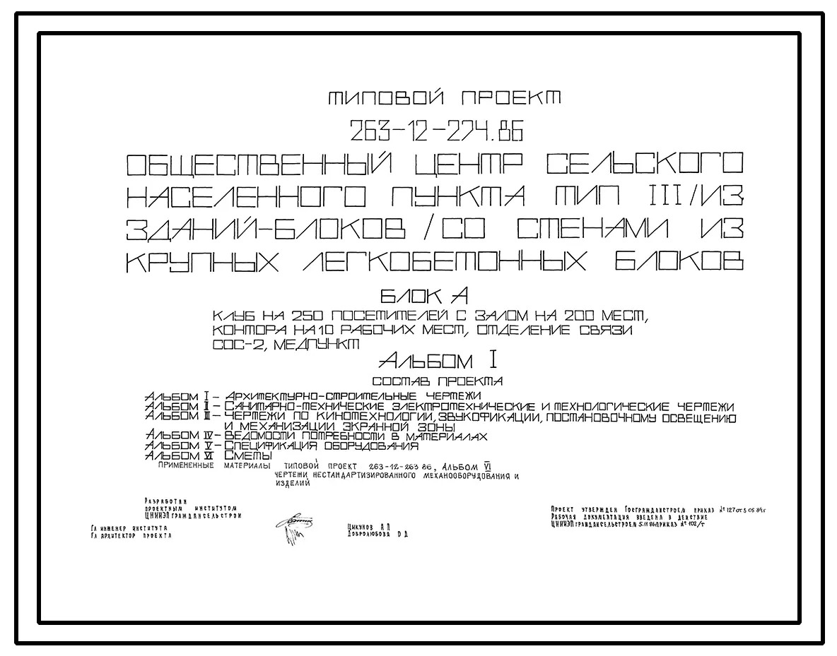 Типовой проект 263-12-274.86 Блок А общественного центра (клуб на 250 посетителей с залом на 200 мест, контора на 10 рабочих мест, отделение связи СОС-2, медпункт) стены из крупных легкобетонных блоков
