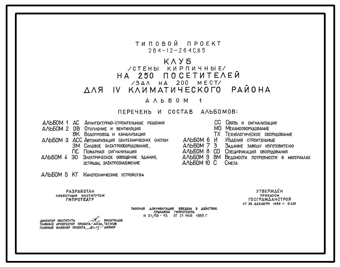 Типовой проект 264-12-264с.85 Клуб (стены кирпичные) на 250 посетителей (зал на 200 мест)