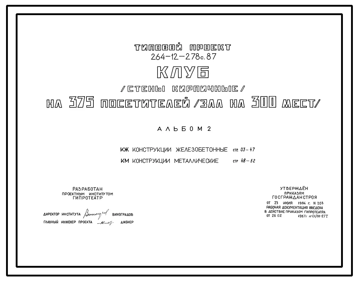 Типовой проект 264-12-278с.87 Клуб (стены кирпичные) на 375 посетителей (зал на 300 мест)