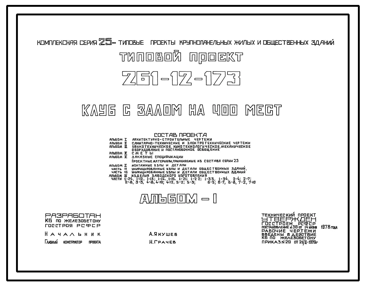 Типовой проект 261-12-173 Клуб с залом на 400 мест. Для строительства в IВ климатическом подрайоне, II и III климатических районах.