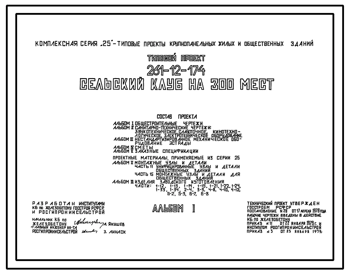 Типовой проект 261-12-174 Сельский клуб на 300 мест. Для строительства в 1В климатическом подрайоне, 2 и 3 климатических районах