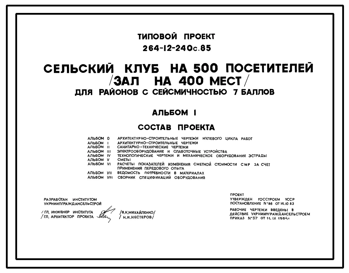 Типовой проект 264-12-240с.85 Сельский клуб на 500 посетителей (зал на 400 мест)