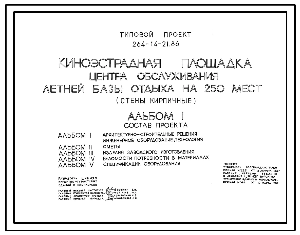 Типовой проект 264-14-21.86 Киноэстрадная площадка центра обслуживания летней базы отдыха на 250 мест (стены кирпичные)