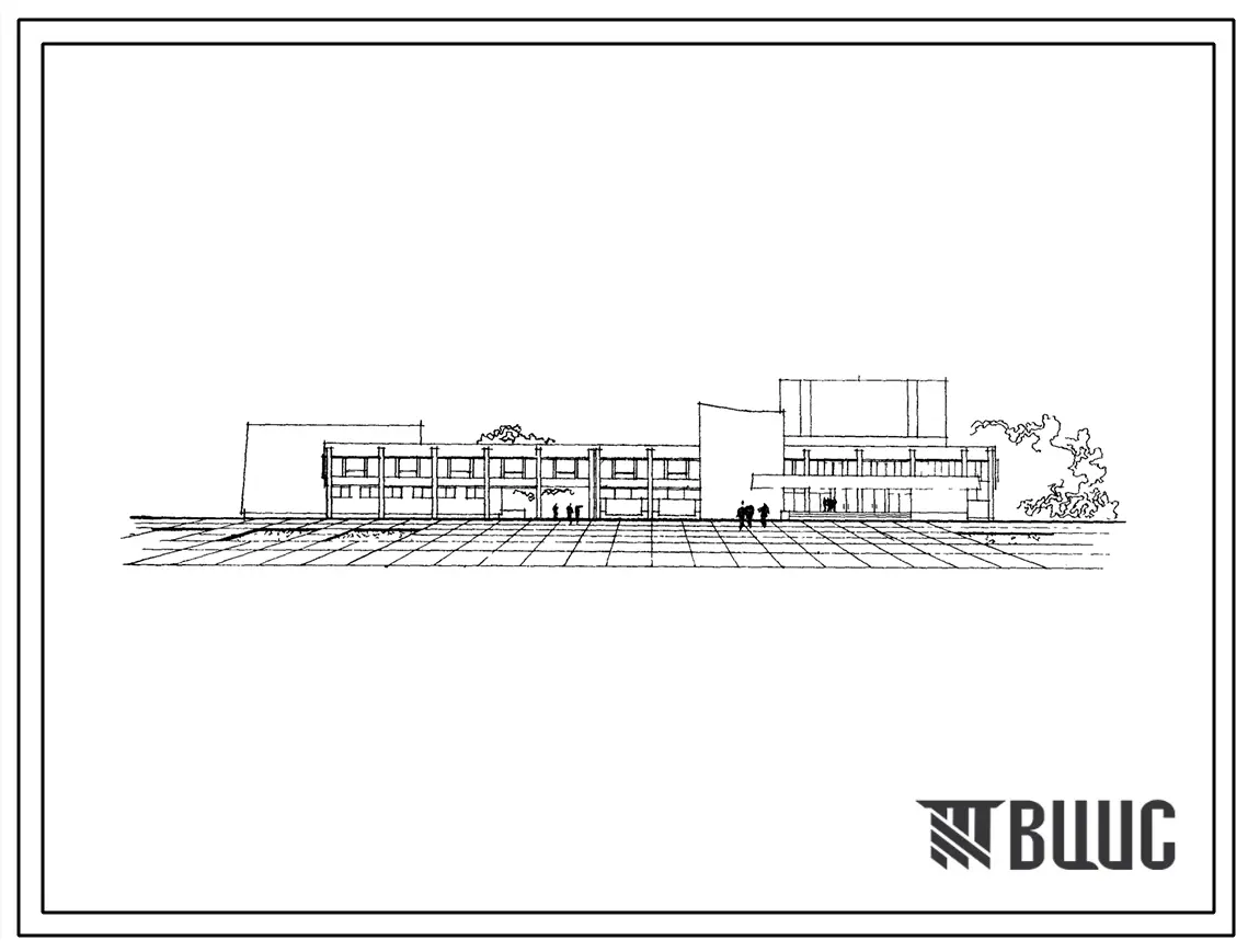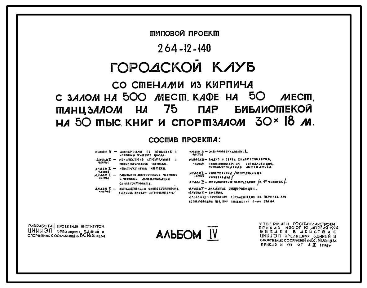 Типовой проект 264-12-140 Городской клуб со стенами из кирпича с залом на 500 мест, кафе на 50 мест, танцзалом на 75 пар, библиотекой на 50 тыс. книг и спортзалом 30х18 м.