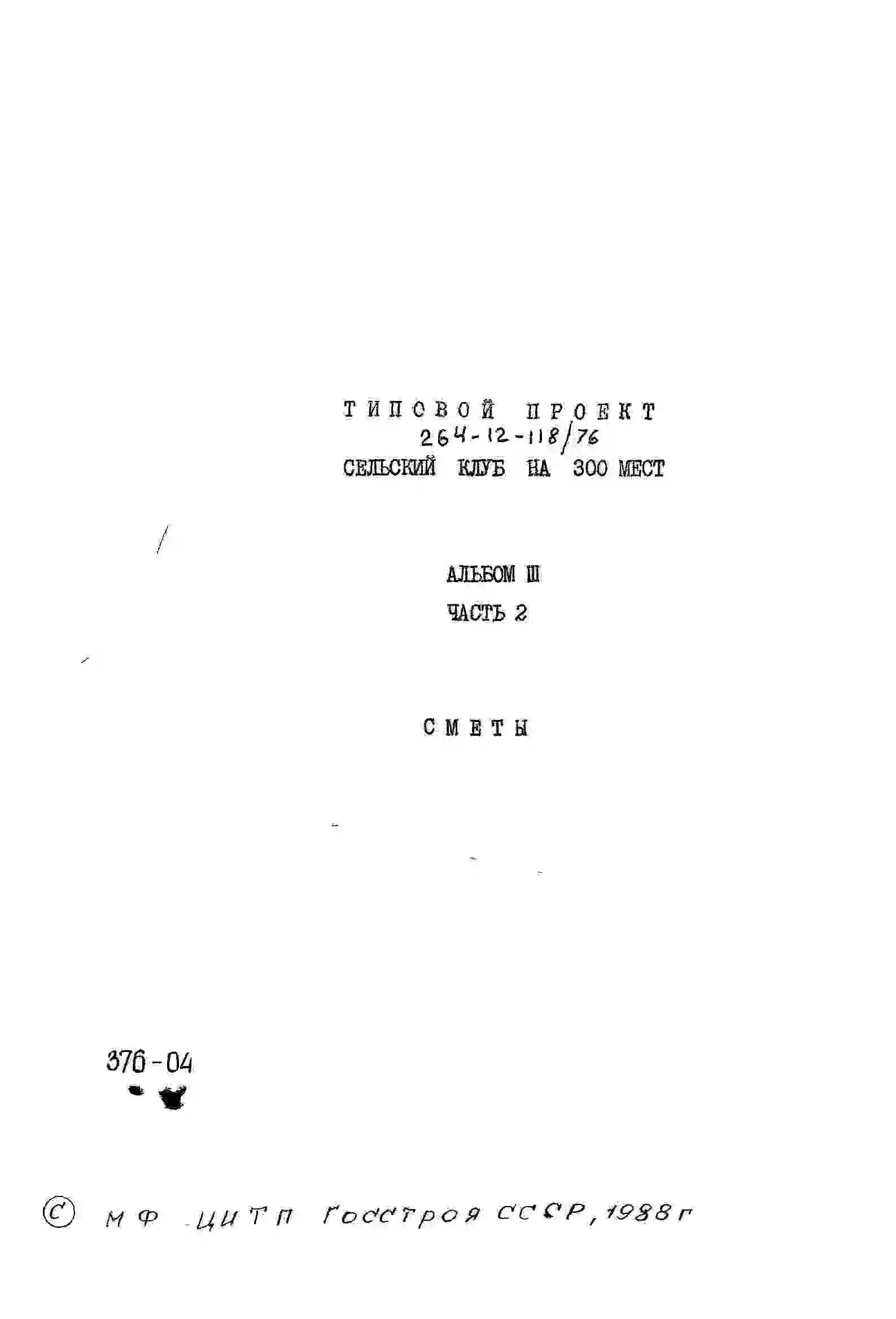 Типовой проект 264-12-118/76 Сельский клуб на 300 мест. Для строительства в Белорусской ССР.