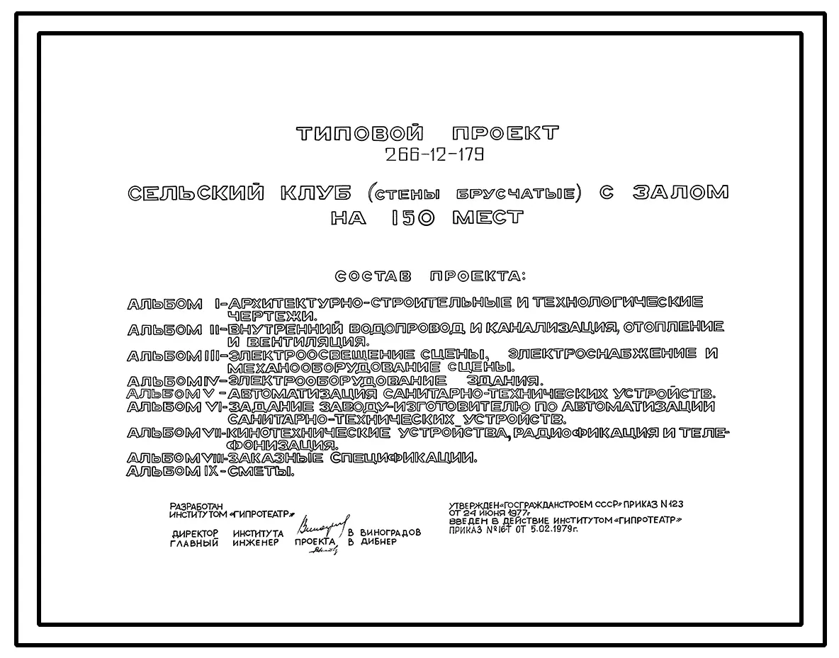 Типовой проект 266-12-179 Сельский клуб (стены брусчатые) с залом на 150 мест. Для строительства в IВ климатическом подрайоне, II и III климатических районах.