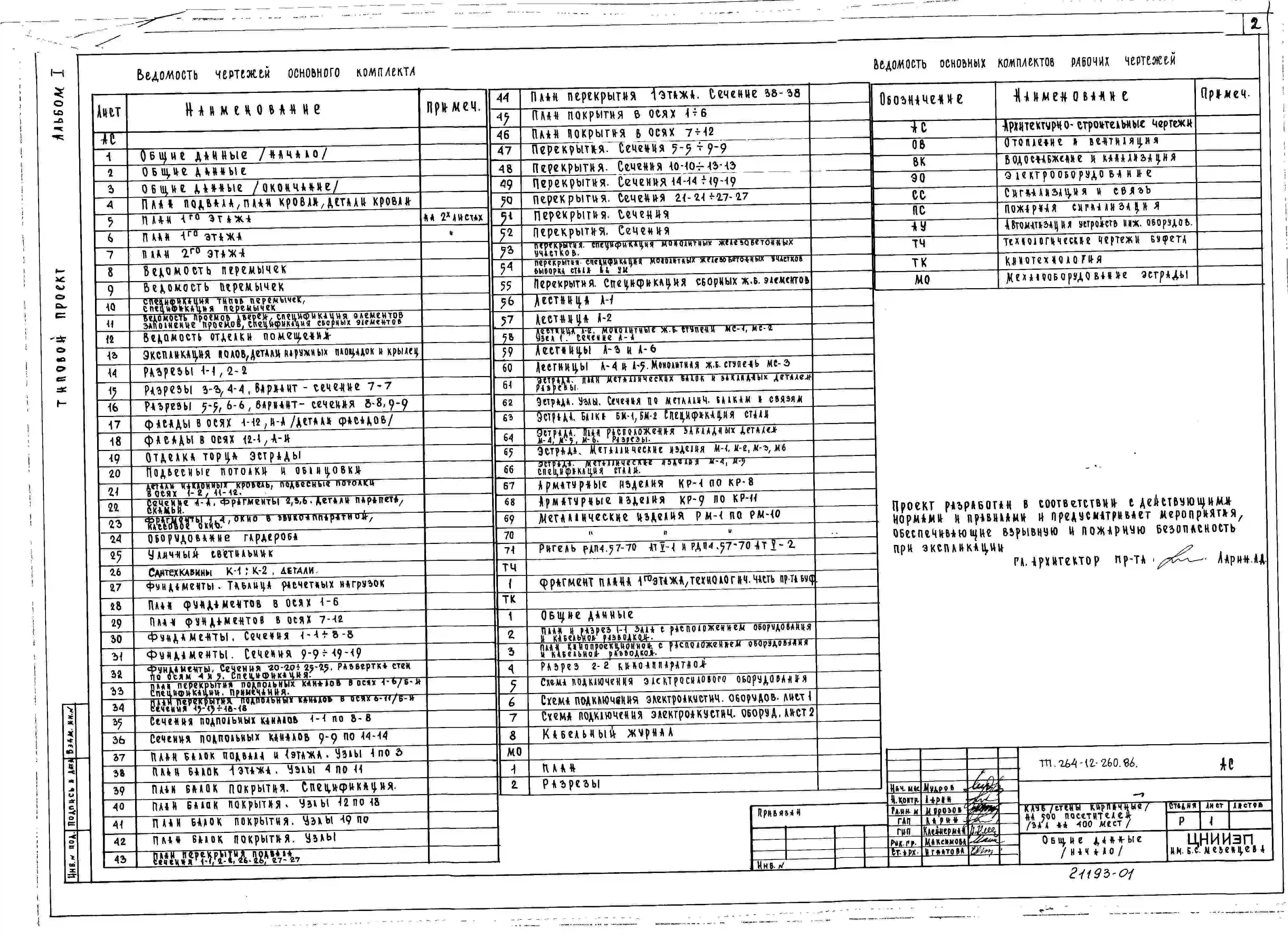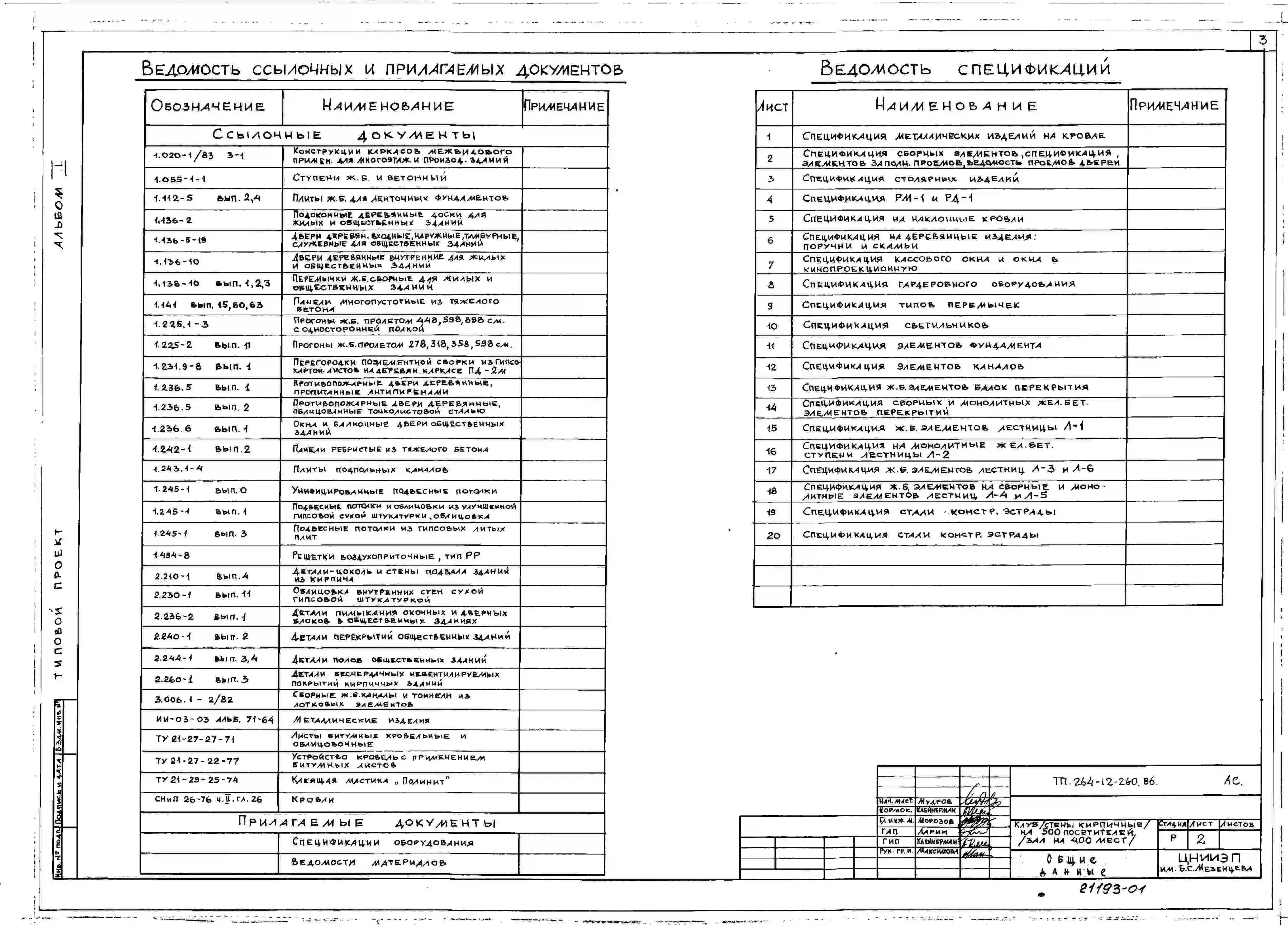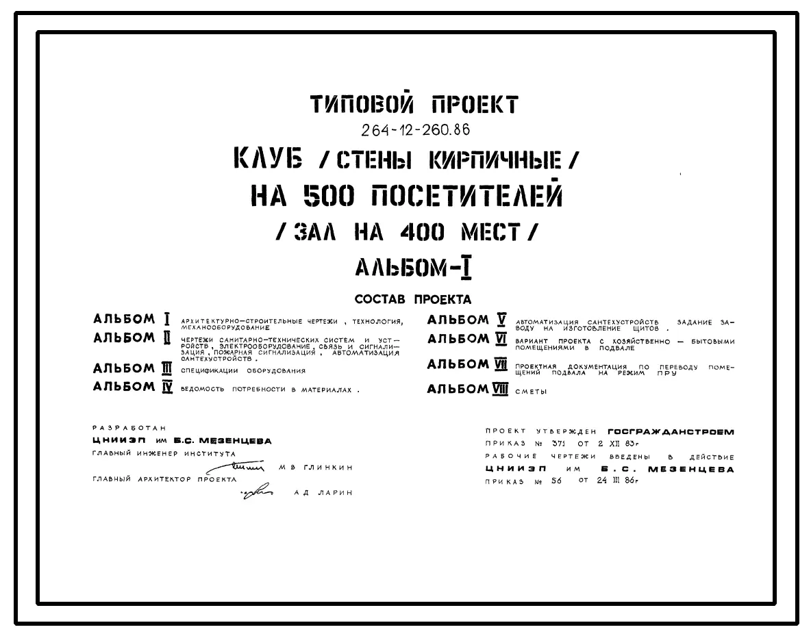 Типовой проект 264-12-260.86 Клуб на 500 посетителей (зал на 400 мест). Стены кирпичные