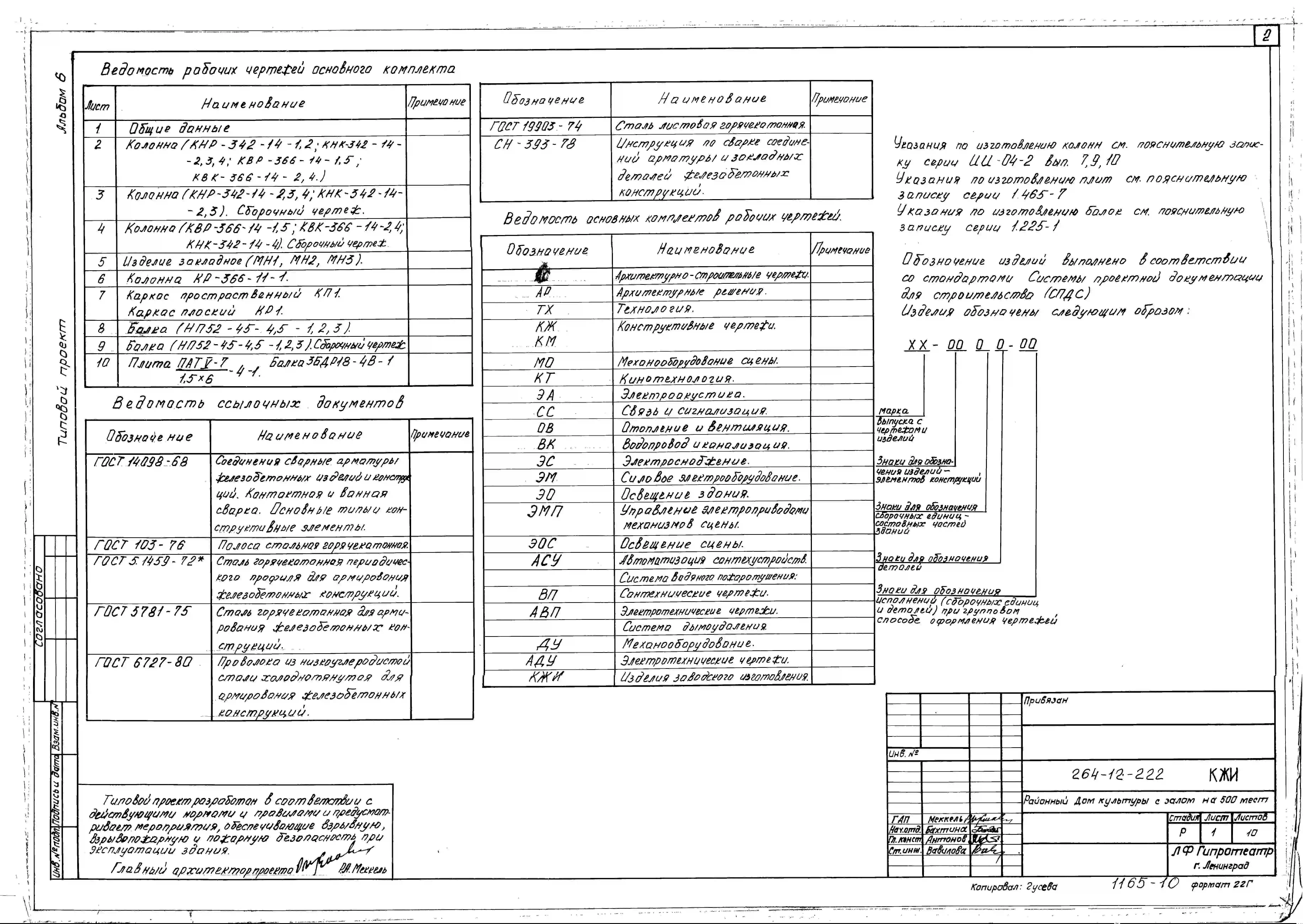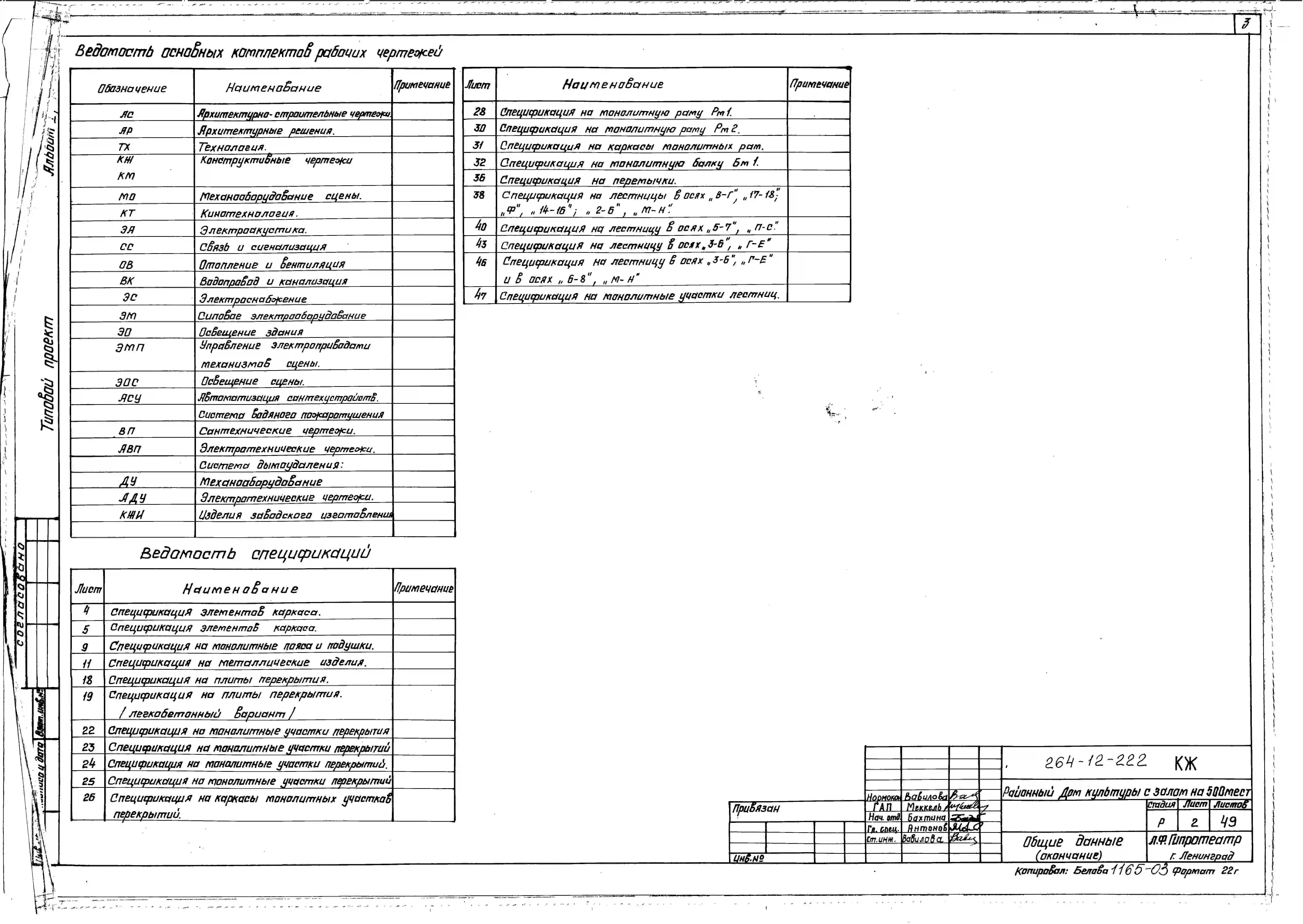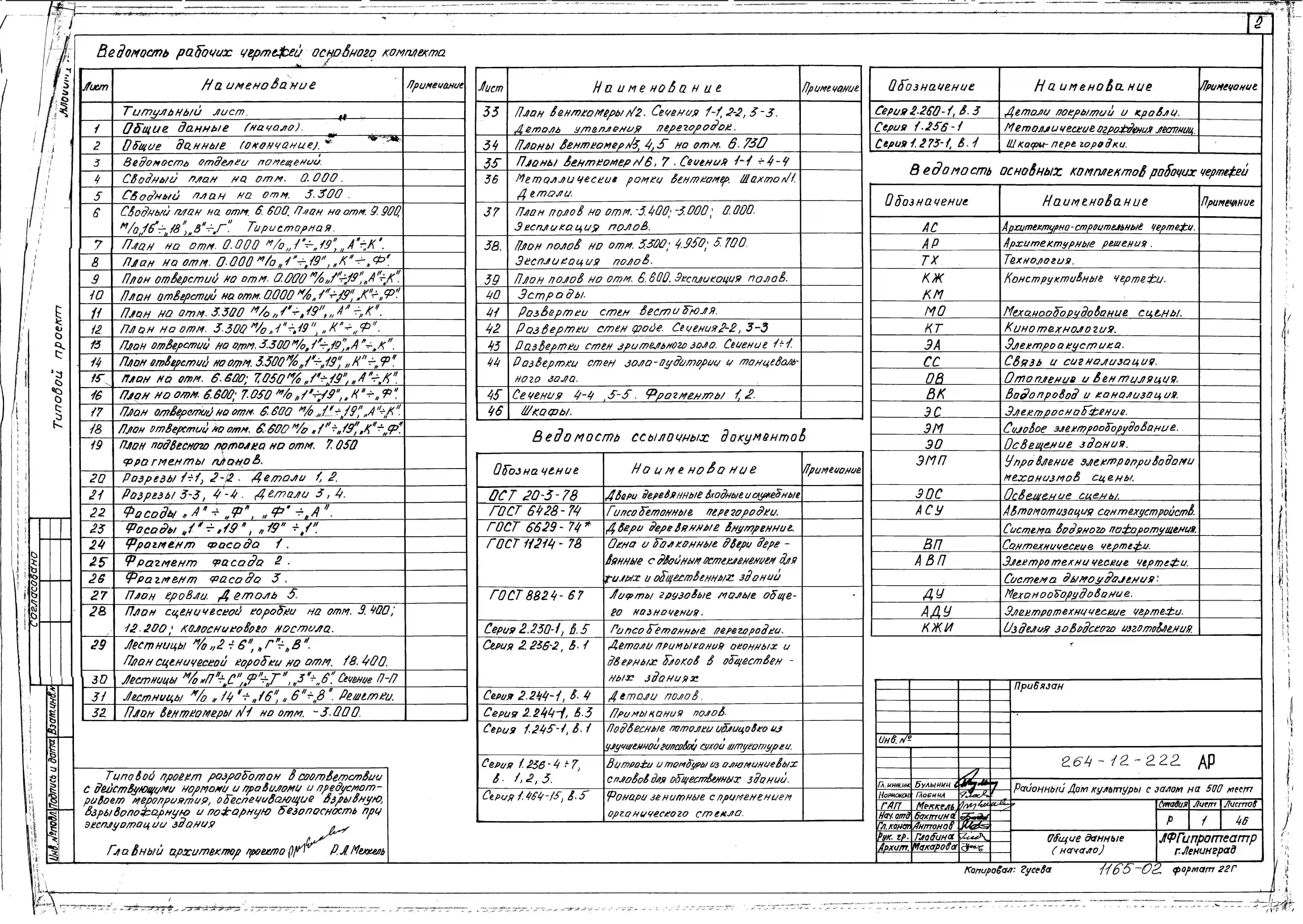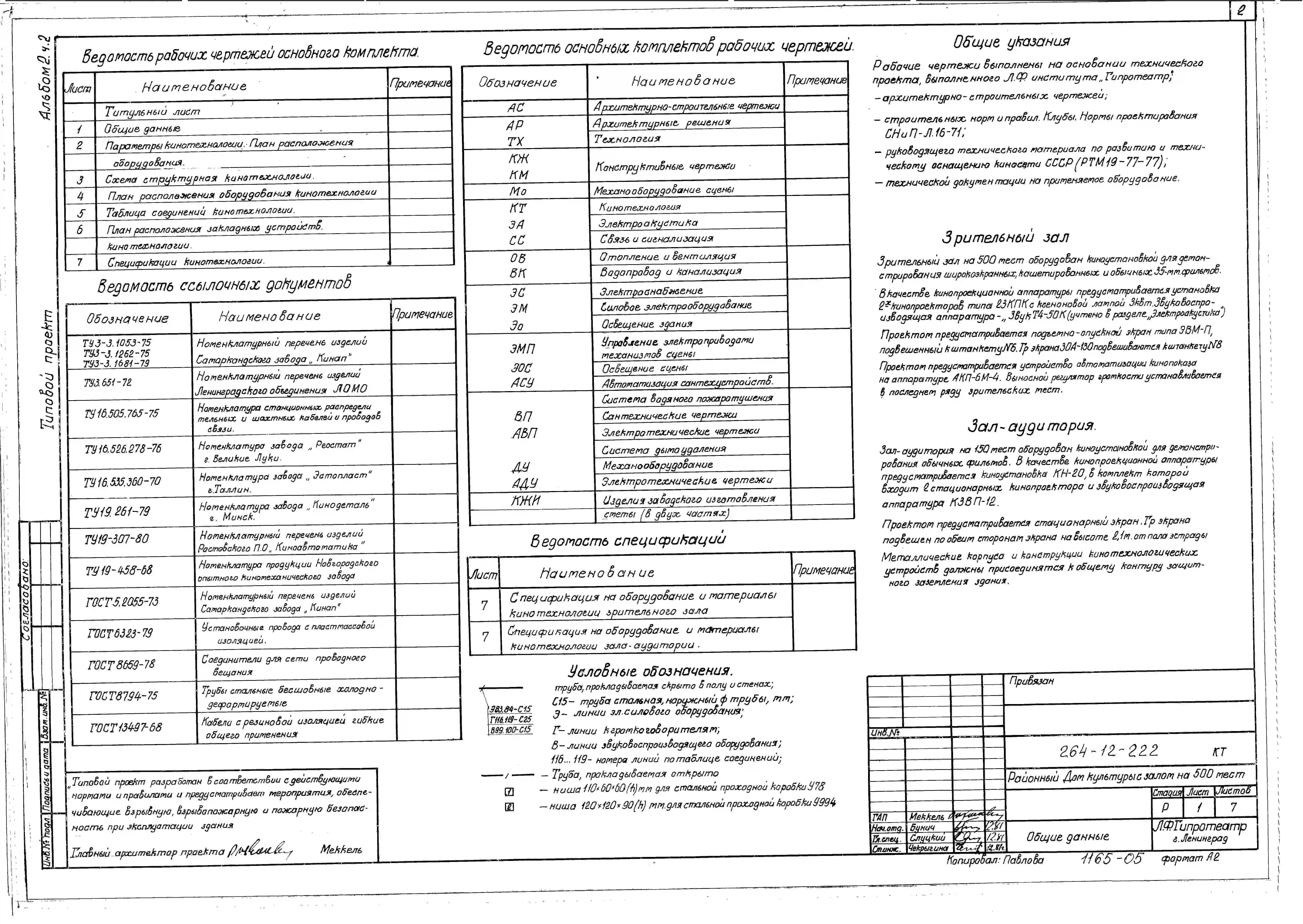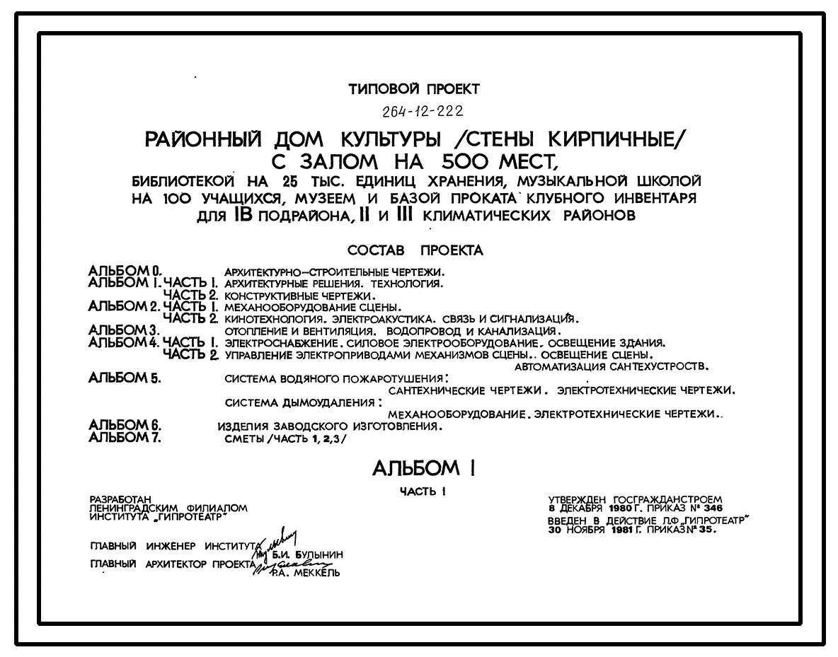 Типовой проект 264-12-222 Районный дом культуры (стены кирпичные) с залом на 500 мест, библиотекой на 25 000 единиц хранения, музыкальной школой на 100 учащихся, музеем и базой проката клубного инвентаря.
