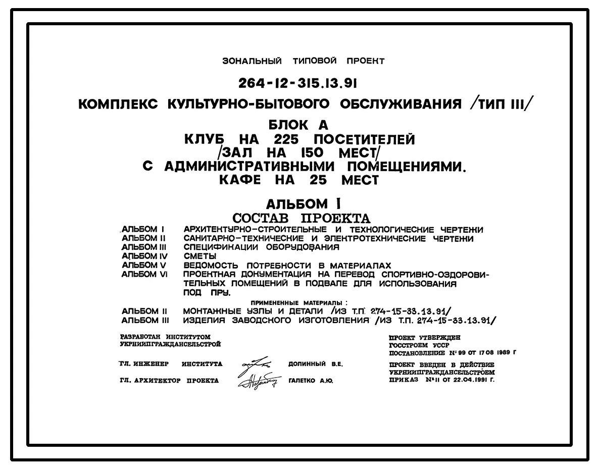 Типовой проект 264-12-315.13.91 Комплекс культурно-бытового обслуживания (тип 3) блок А. Клуб на 225 посетителей (зал на 150 мест) с административными помещениями. Кафе на 25 мест
