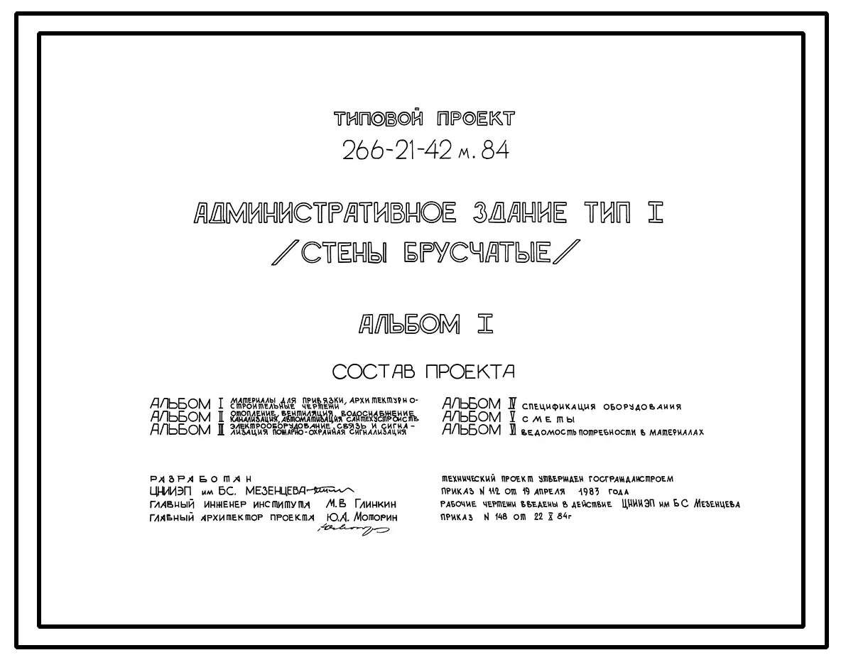 Типовой проект 266-21-42м.84 Административное здание. Стены брусчатые. Для строительства в 1А, 11Б, 1Г климатических подрайонах на вечномерзлых грунтах, используемых по принципу 1