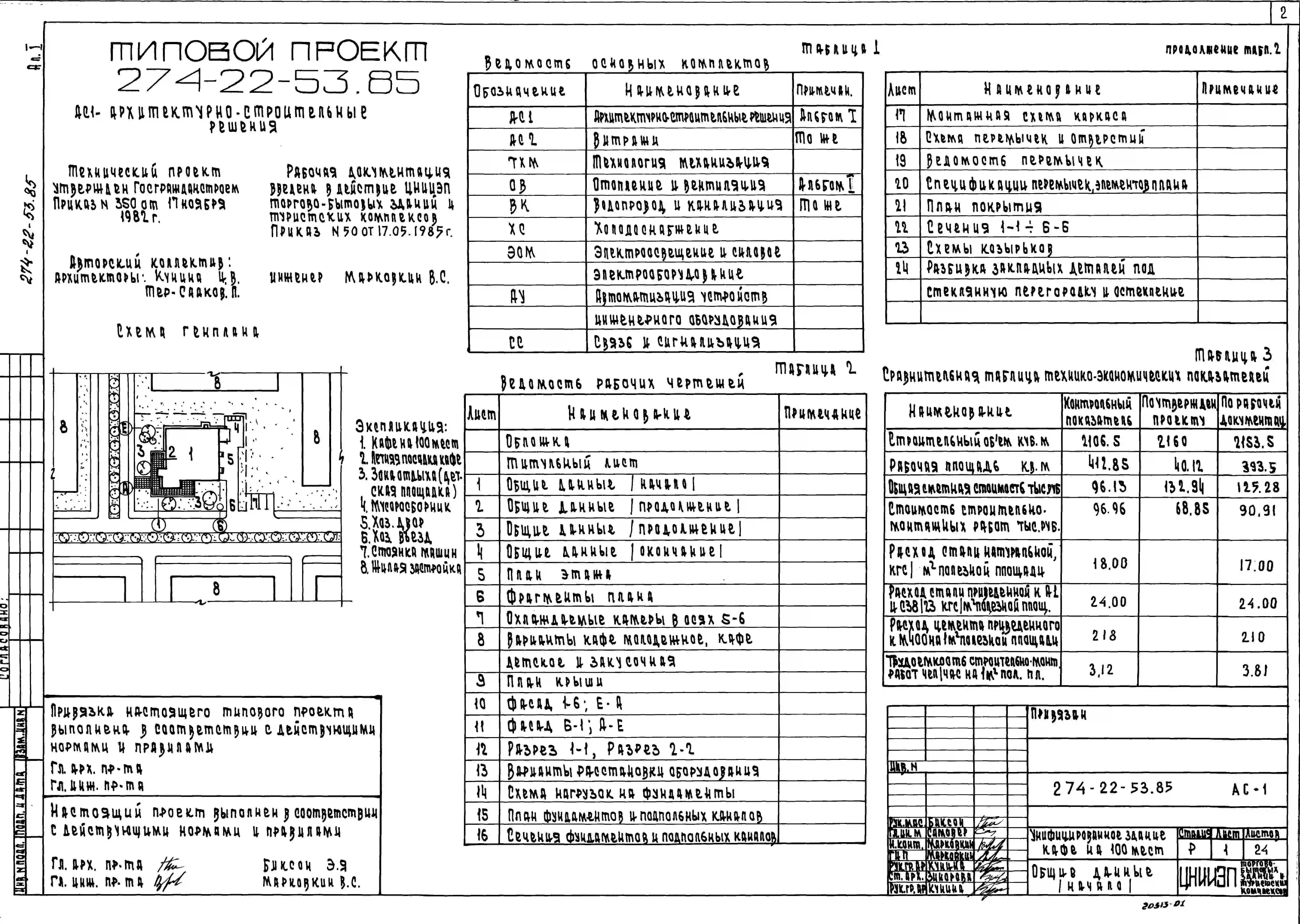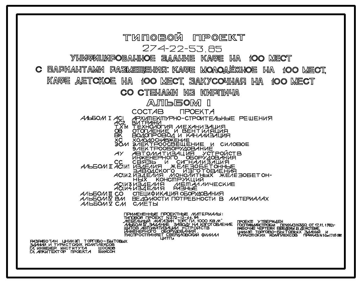 Типовой проект 274-22-53.85 Здание кафе на 100 мест с вариантом размещения: кафе молодежное на 100 мест, кафе детское на 100 мест, закусочная на 100 мест. Здание одноэтажное. Каркас сборный железобетонный серии 1.020-1/83. Стены из кирпича.
