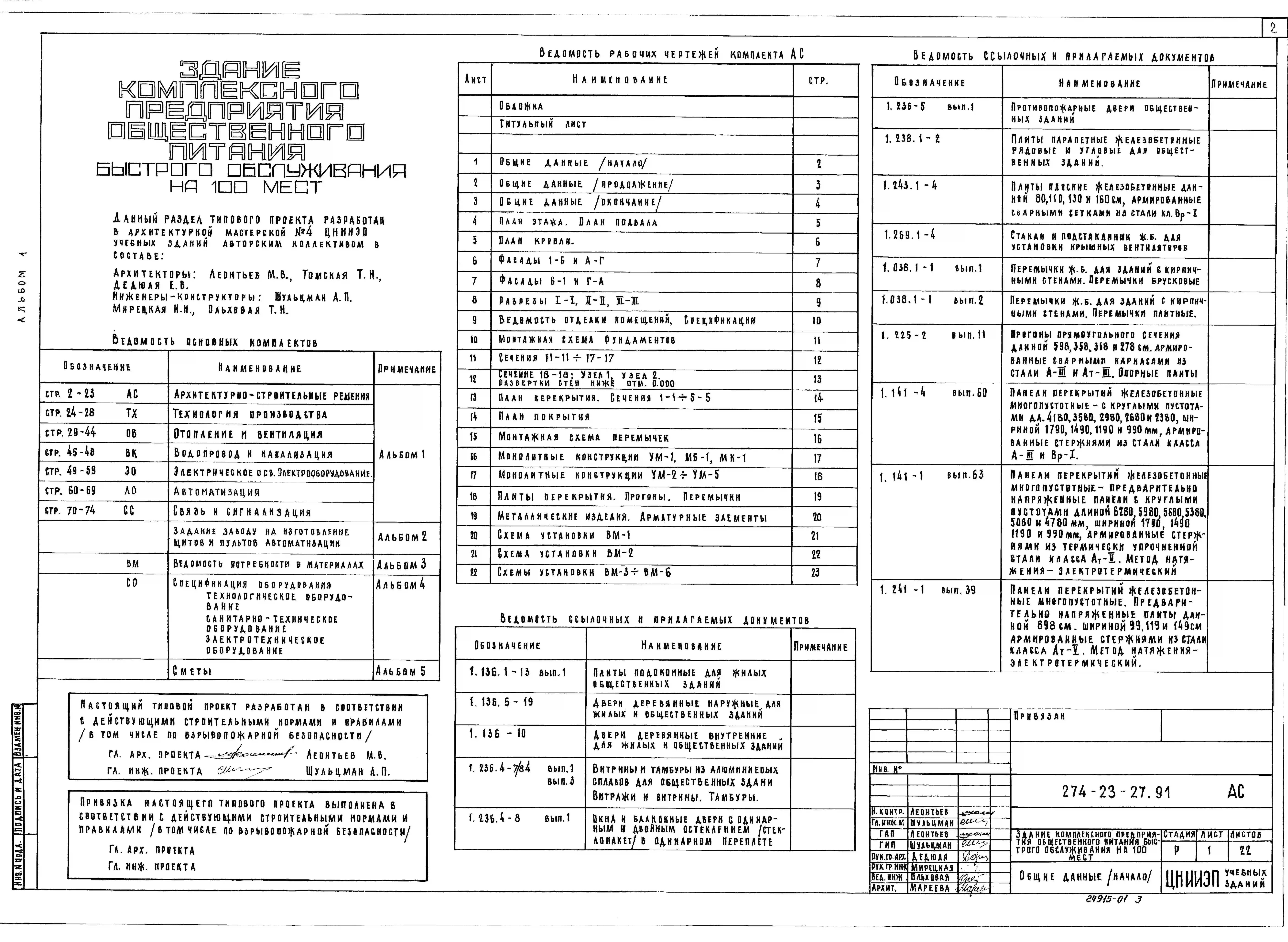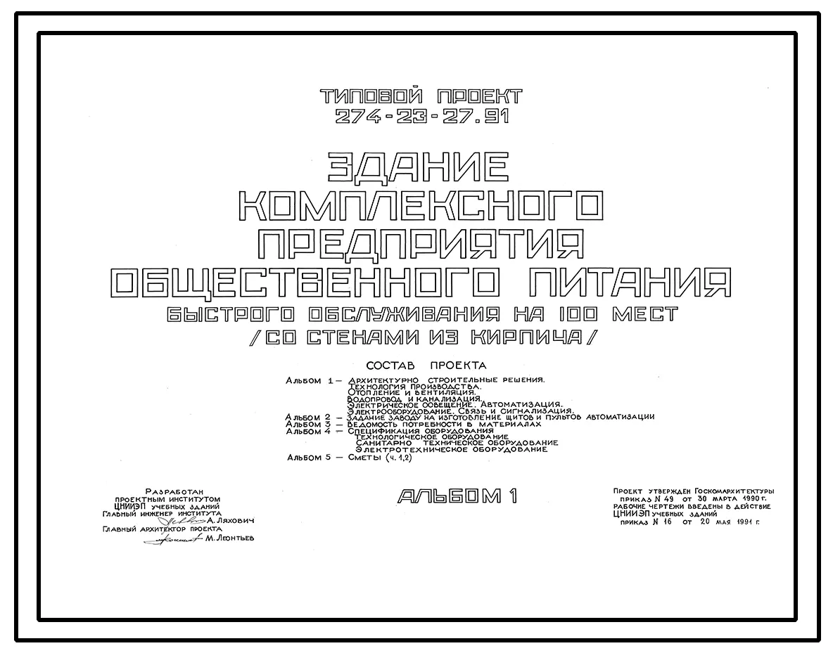 Типовой проект 274-23-27.91 Здание комплексного предприятия общественного питания быстрого обслуживания на 100 мест. Здание одноэтажное. Стены из кирпича.
