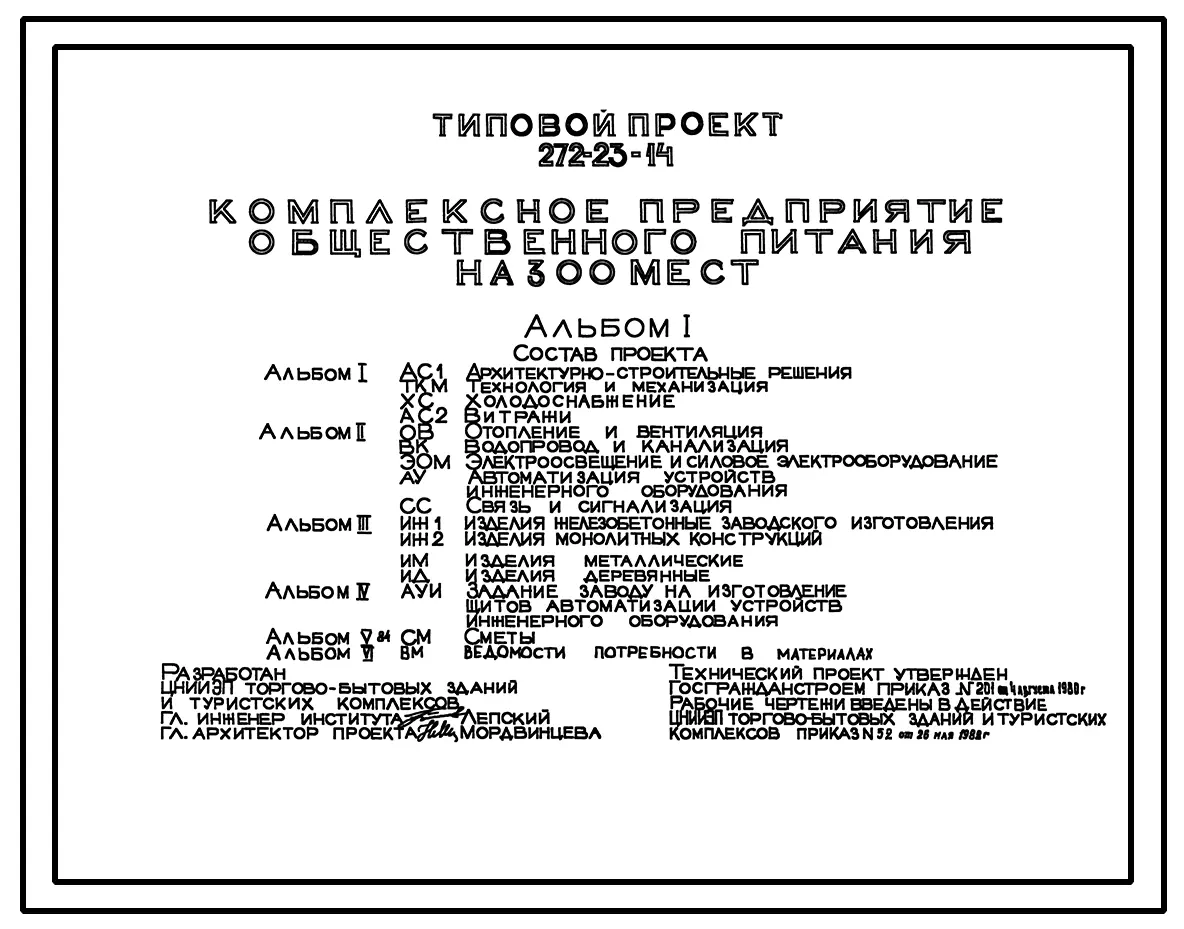 Типовой проект 272-23-14 Комплексное предприятие общественного питания на 300 мест. Здание двухэтажное. Каркас сборный железобетонный серии 1.020-1. Стены из легкобетонных панелей.