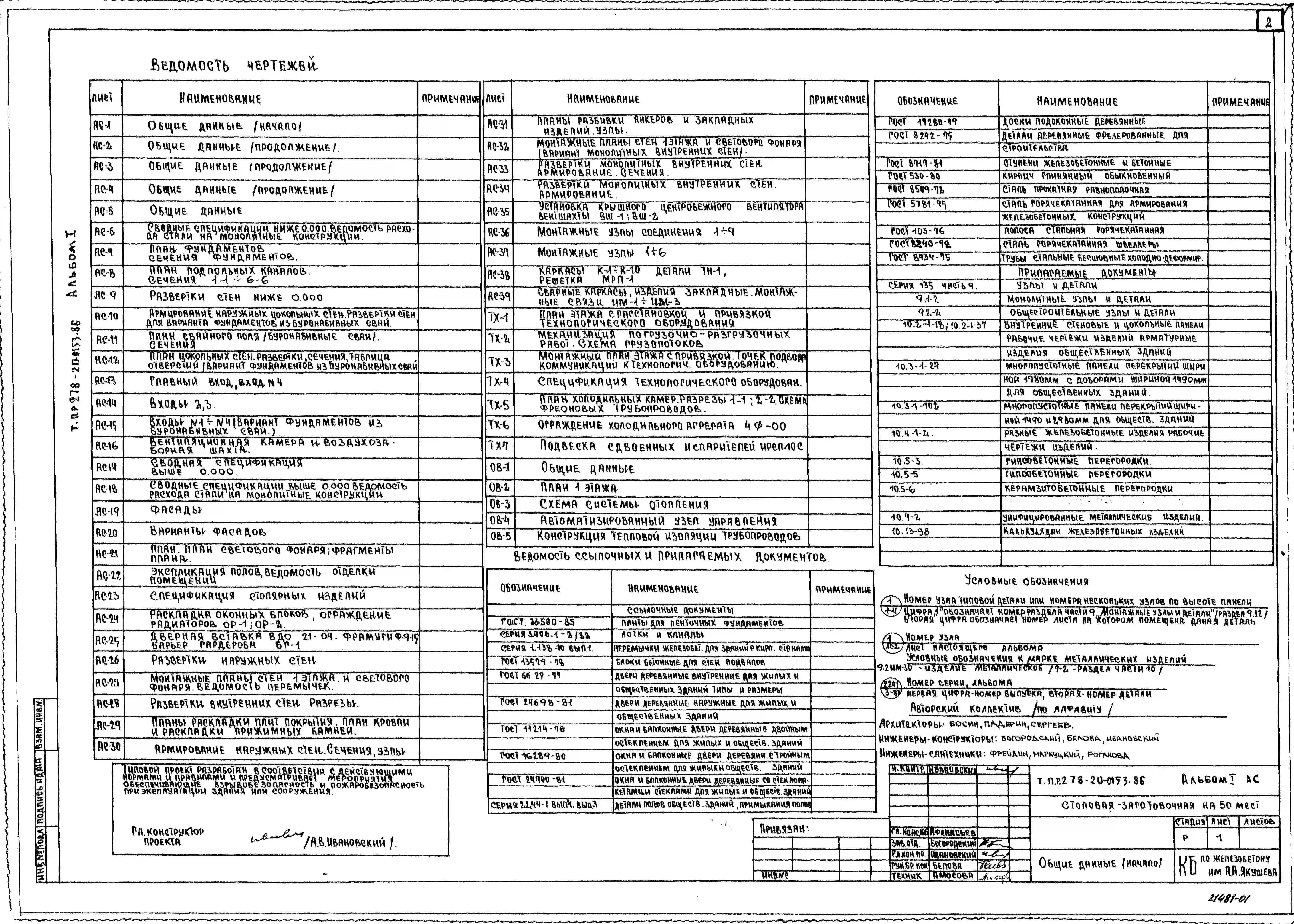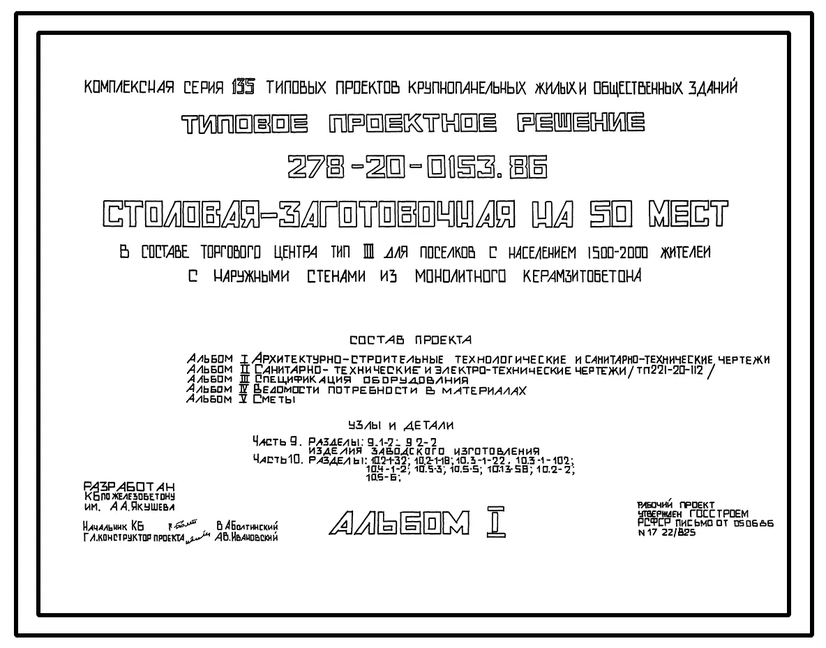 Типовой проект 278-20-0153.86 Столовая – заготовочная на 50 мест в составе торгового центра типа II для поселков с населением 1500-2000 жителей. Здание одноэтажное. Стены из монолитного керамзитобетона.