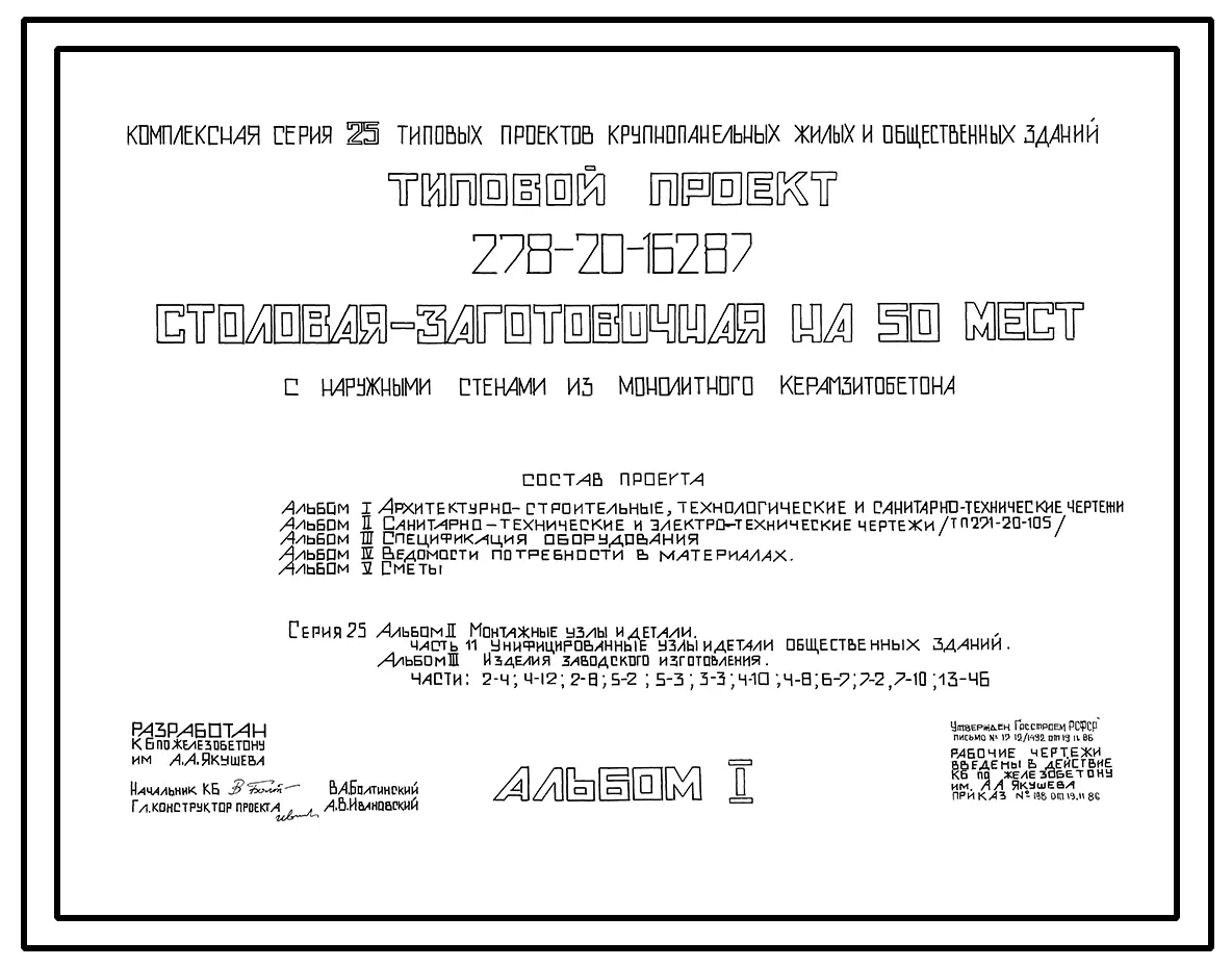Типовой проект 278-20-162.87 Столовая – заготовочная на 50 мест. Здание одноэтажное. Стены из монолитного керамзитобетона.