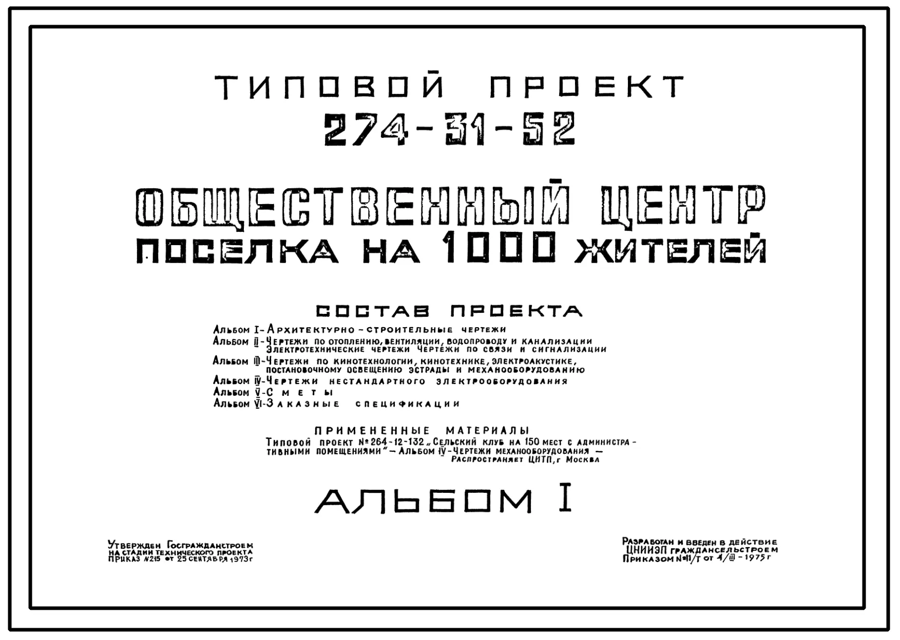 Типовой проект 274-31-52 Общественный центр поселка на 1000 жителей, для строительства в 1В климатическом подрайоне, 2 и 3 климатических районах