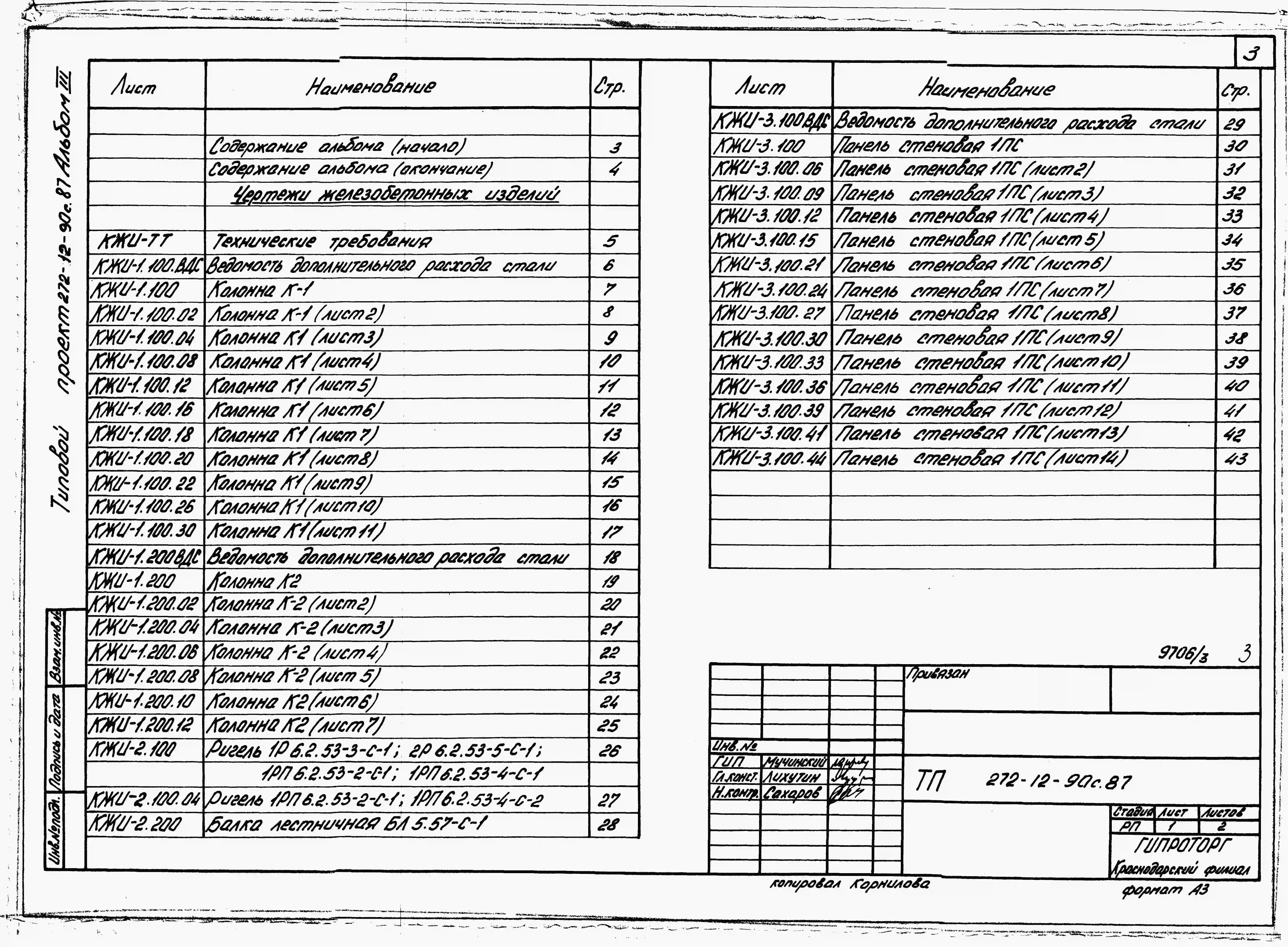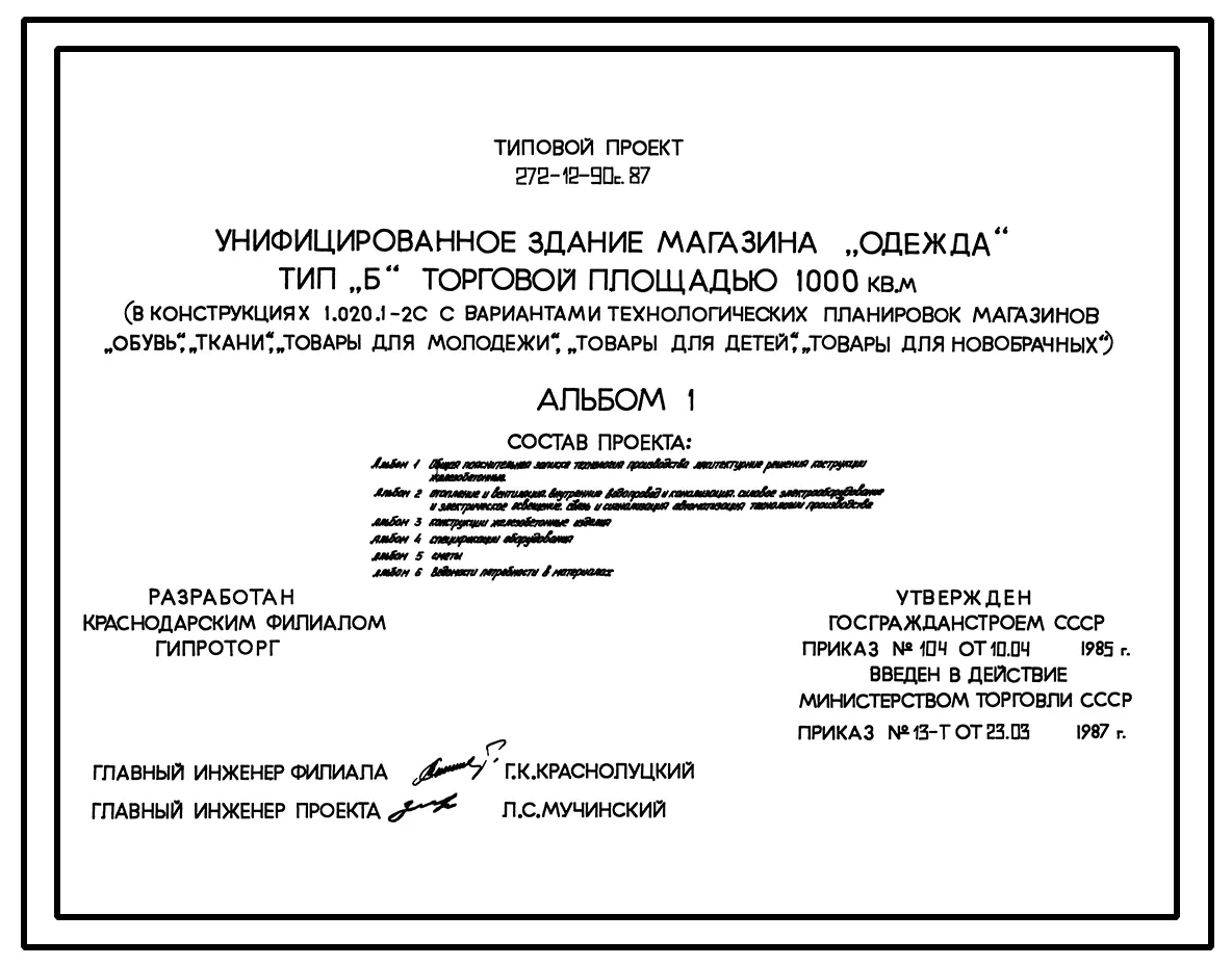 Типовой проект 272-12-90с.87. Унифицированное здание магазина "Одежда", тип "Б" торговой площадью 1000 кв. м. (в конструкциях 1.020.1-2с).