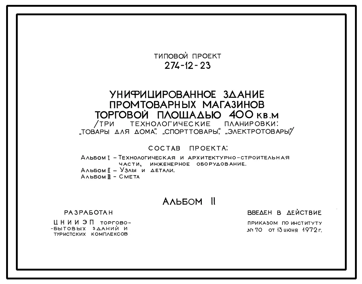 Типовой проект 274-12-23 Унифицированное здание промтоварных магазинов торговой площадью 400м2 (три технологические планировки; «Товары для дома» «Спорттовары» «Электротовары») для строительства в 1В климатическом подрайоне, во 2 и 3 климатических районах