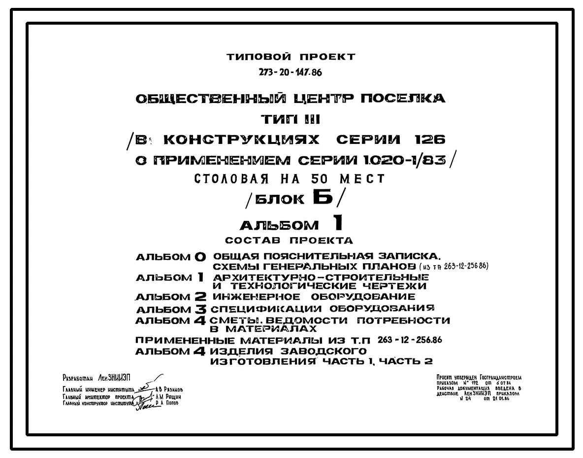 Типовой проект 273-20-147.86 Столовая на 50 мест (блок «Б») общественного центра поселка типа 3. В конструкциях серии 126 с применением серии 1.020-1/83
