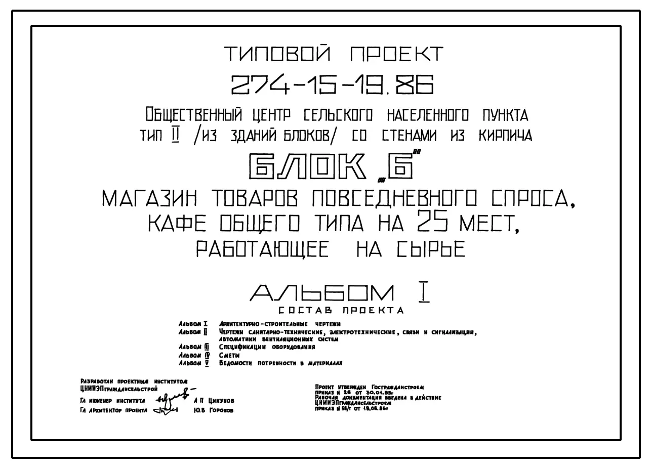 Типовой проект 274-15-19.86 Общественный центр сельского населенного пункта. Блок Б. Магазин повседневного спроса. Кафе на 25 мест.