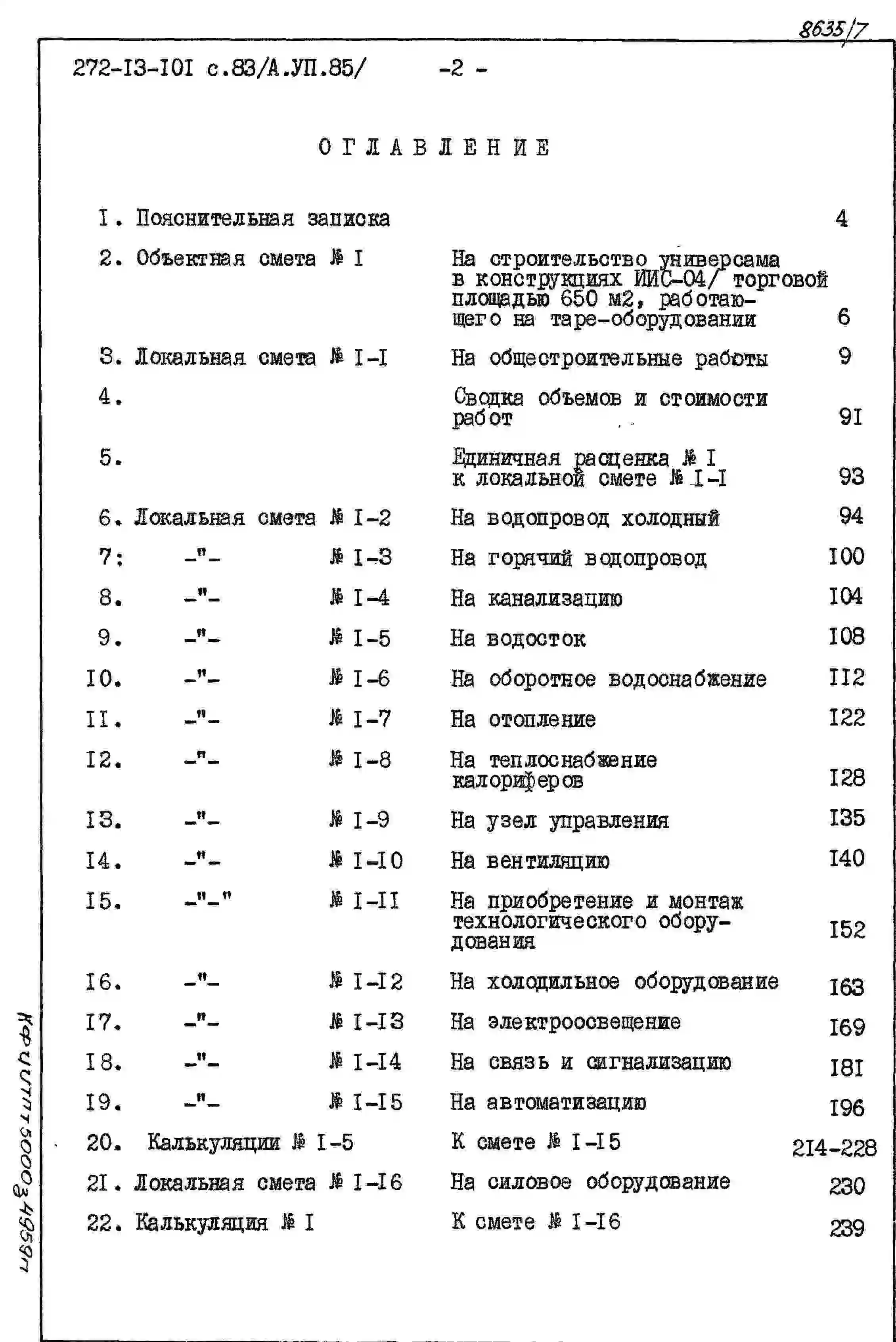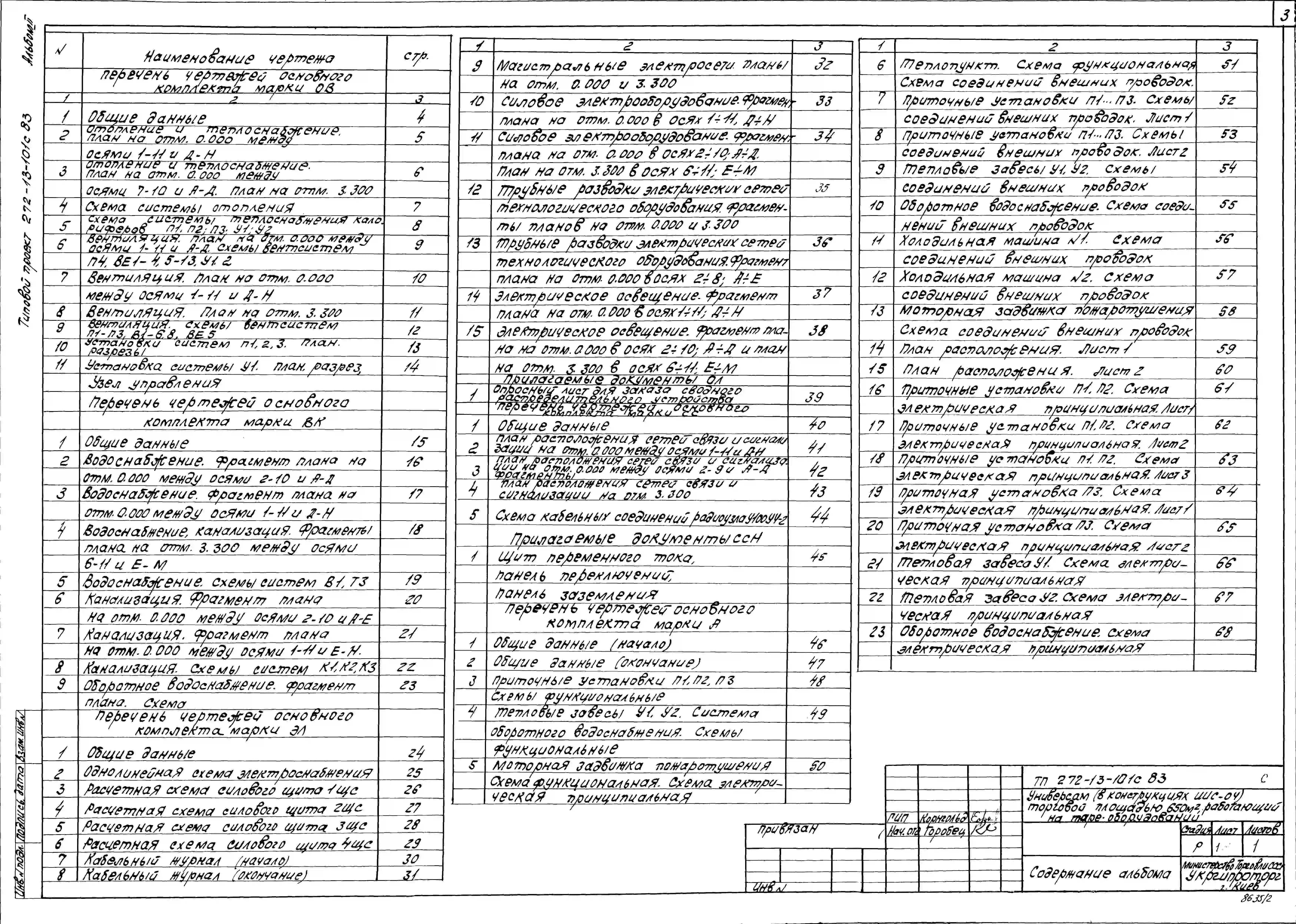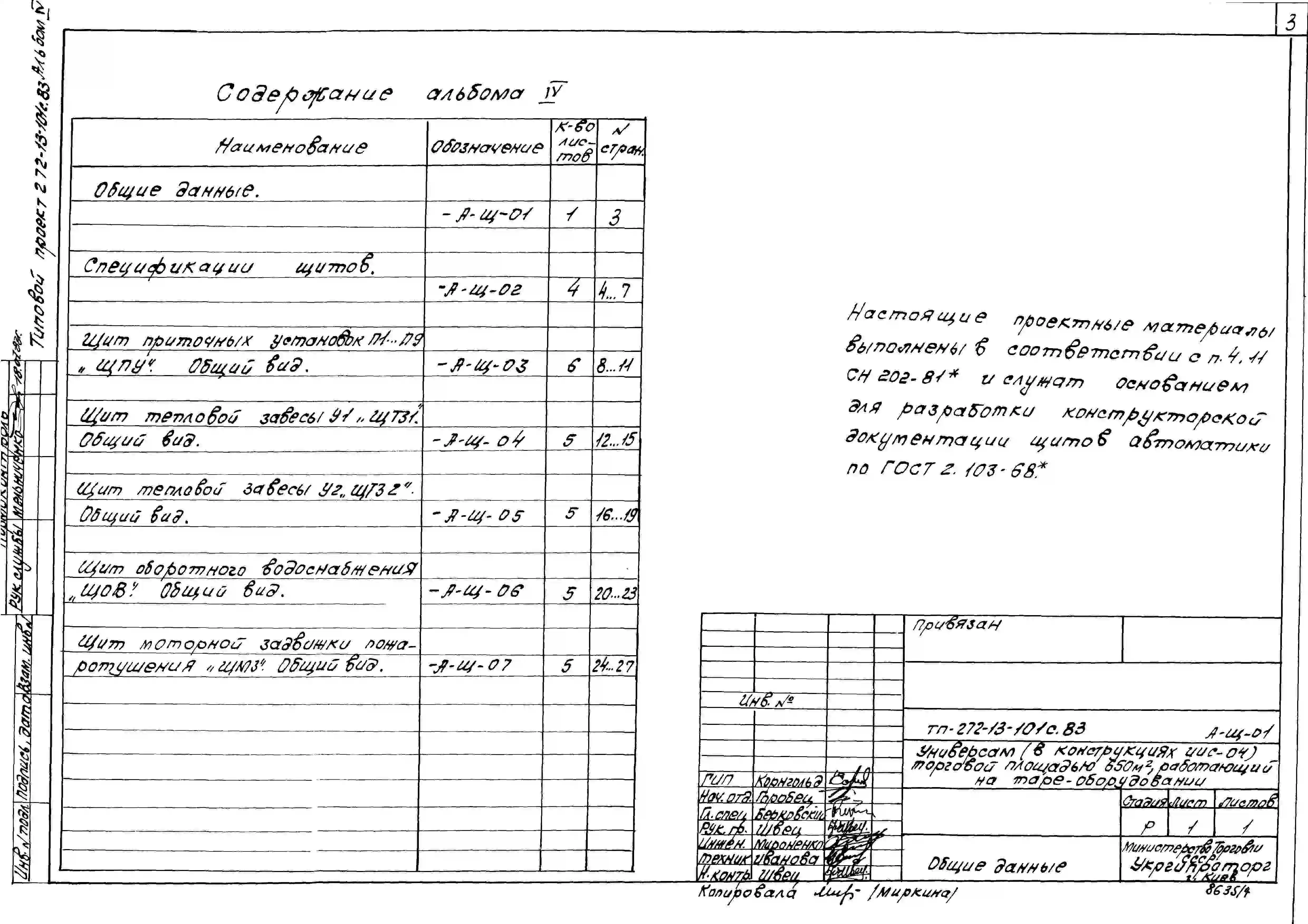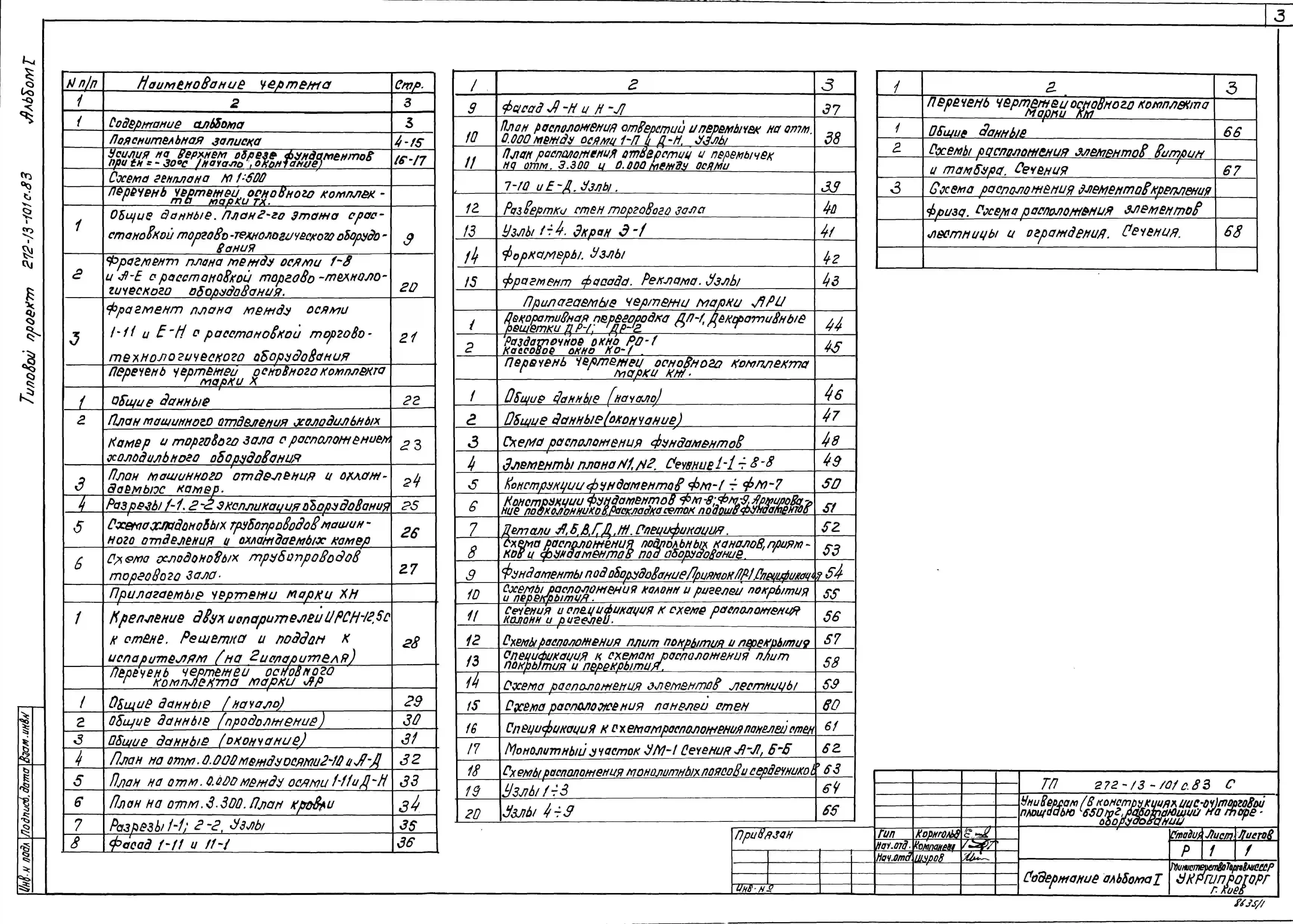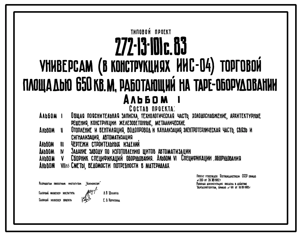 Типовой проект 272-13-101с.83 Универсам (в конструкции ИИС-04) торговой площадью 650 кв.м., работающий на таре-оборудовании. Для строительства в 1В климатическом подрайоне, 2 и 3 климатических районах сейсмичностью 7 и 8 баллов.
