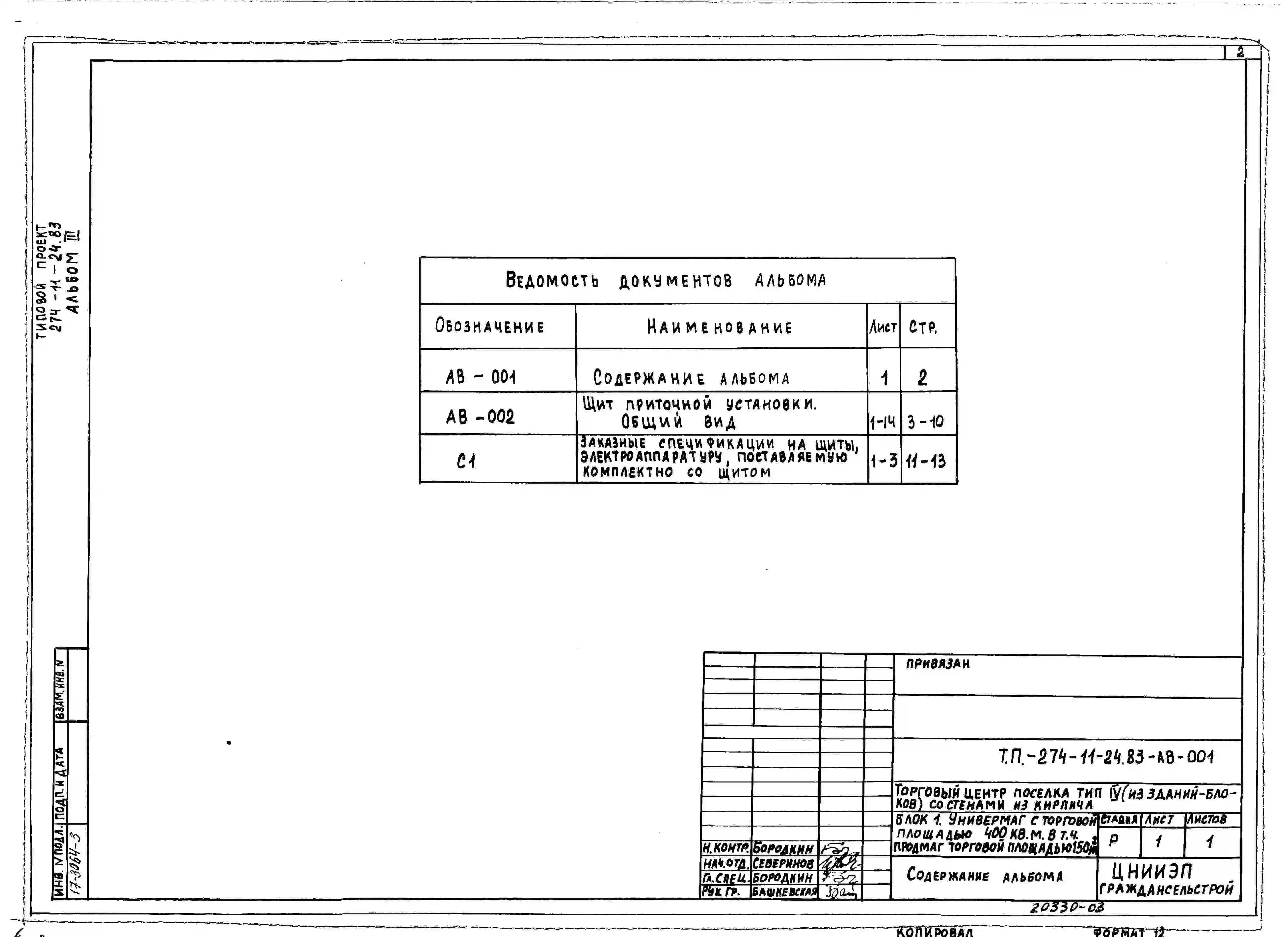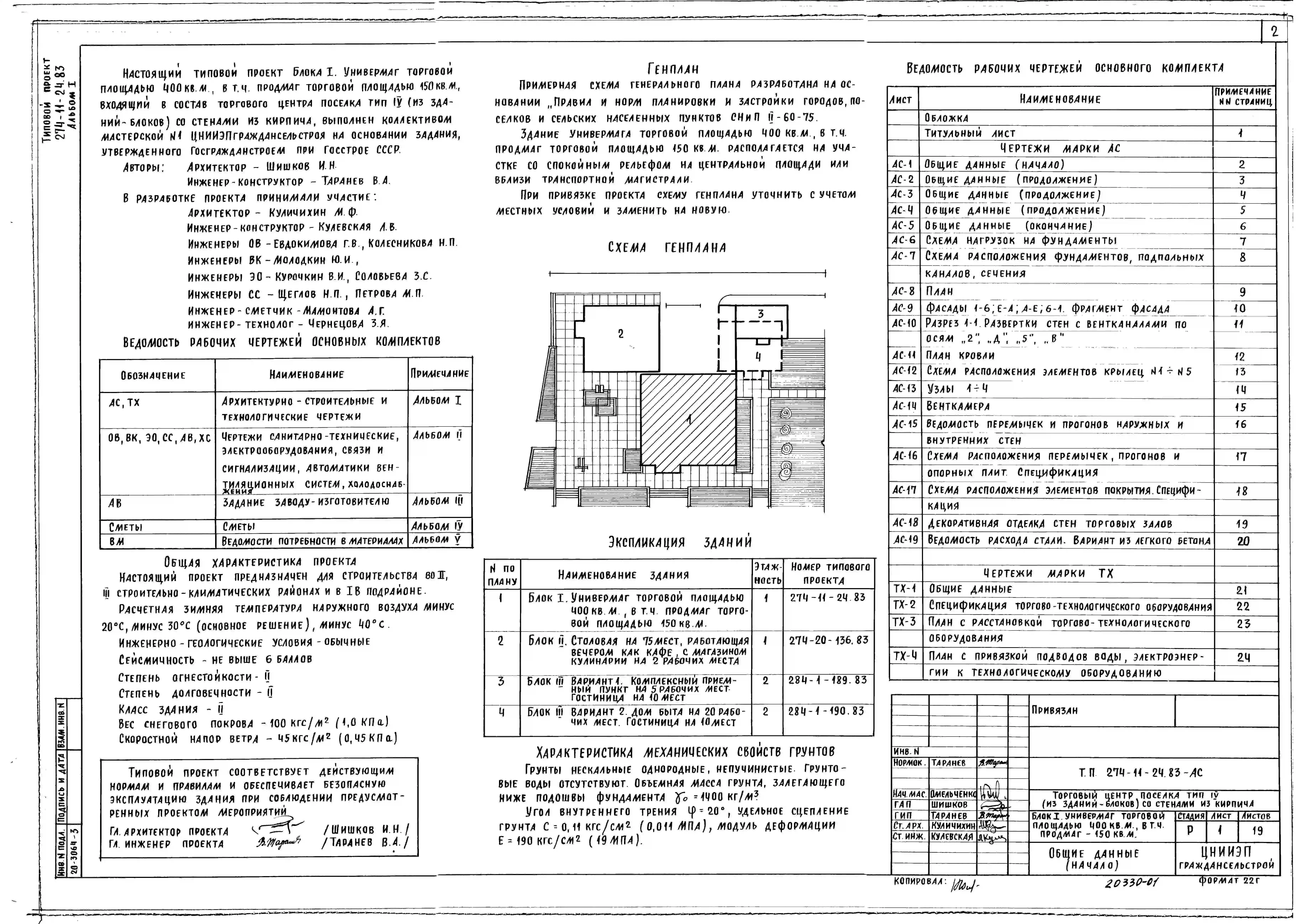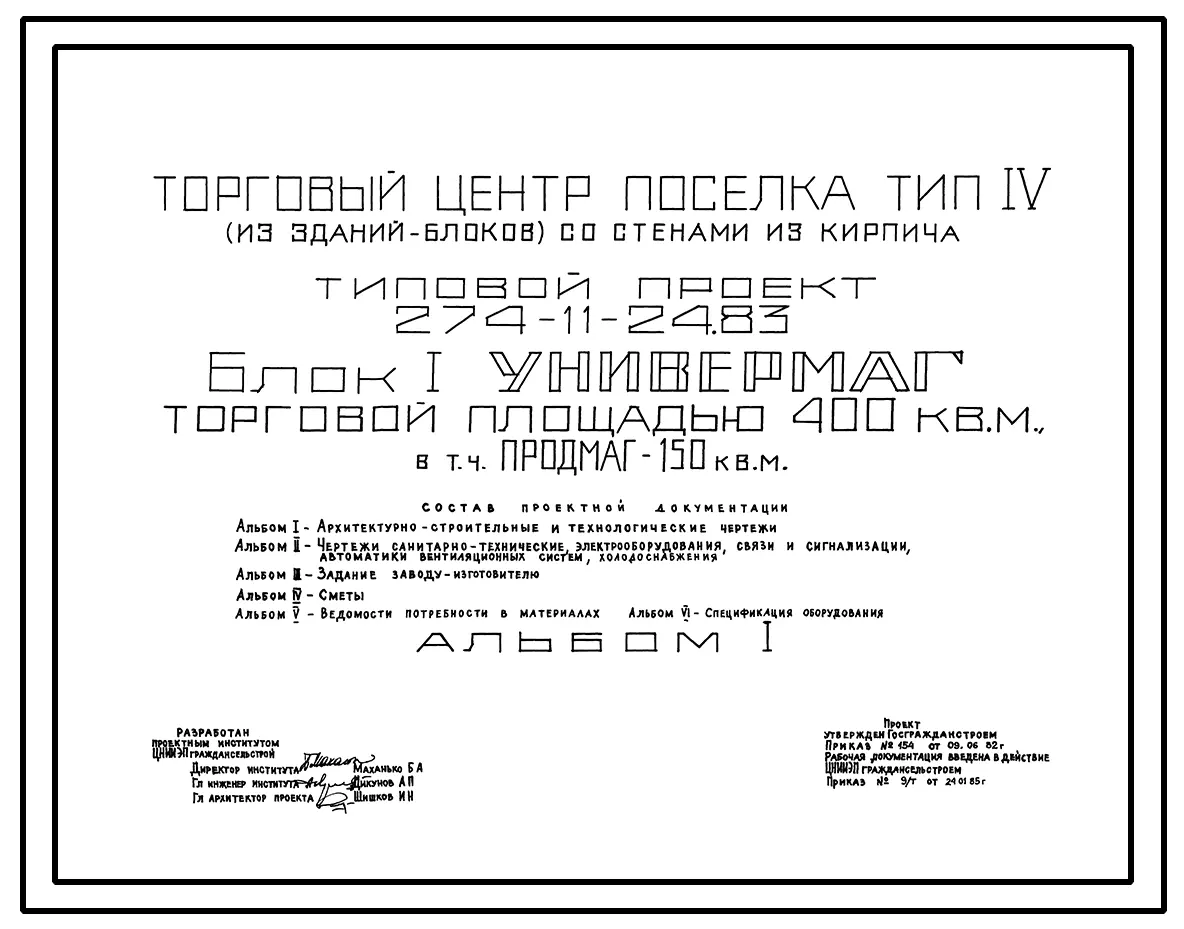 Типовой проект 274-11-24.83 Блок 1. Универмаг торговой площадью 400 кв.м в том числе продовольственный магазин торговой площадью 150 м2. Торговый центр поселка. Для строительства в 1В климатическом подрайоне, 2 и 3 климатических районах.