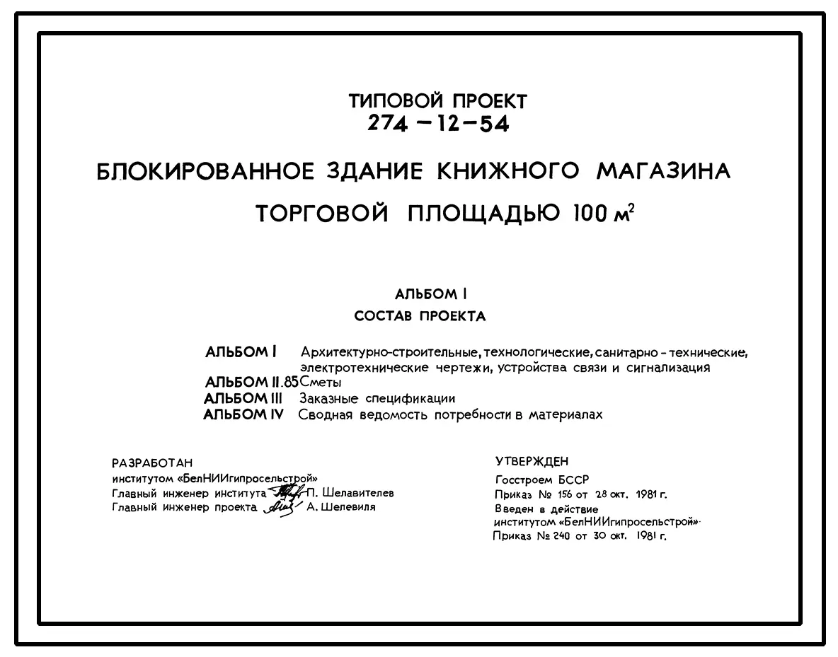 Типовой проект 274-12-54 Блокированное здание книжного магазина торговой площадью 100 м2