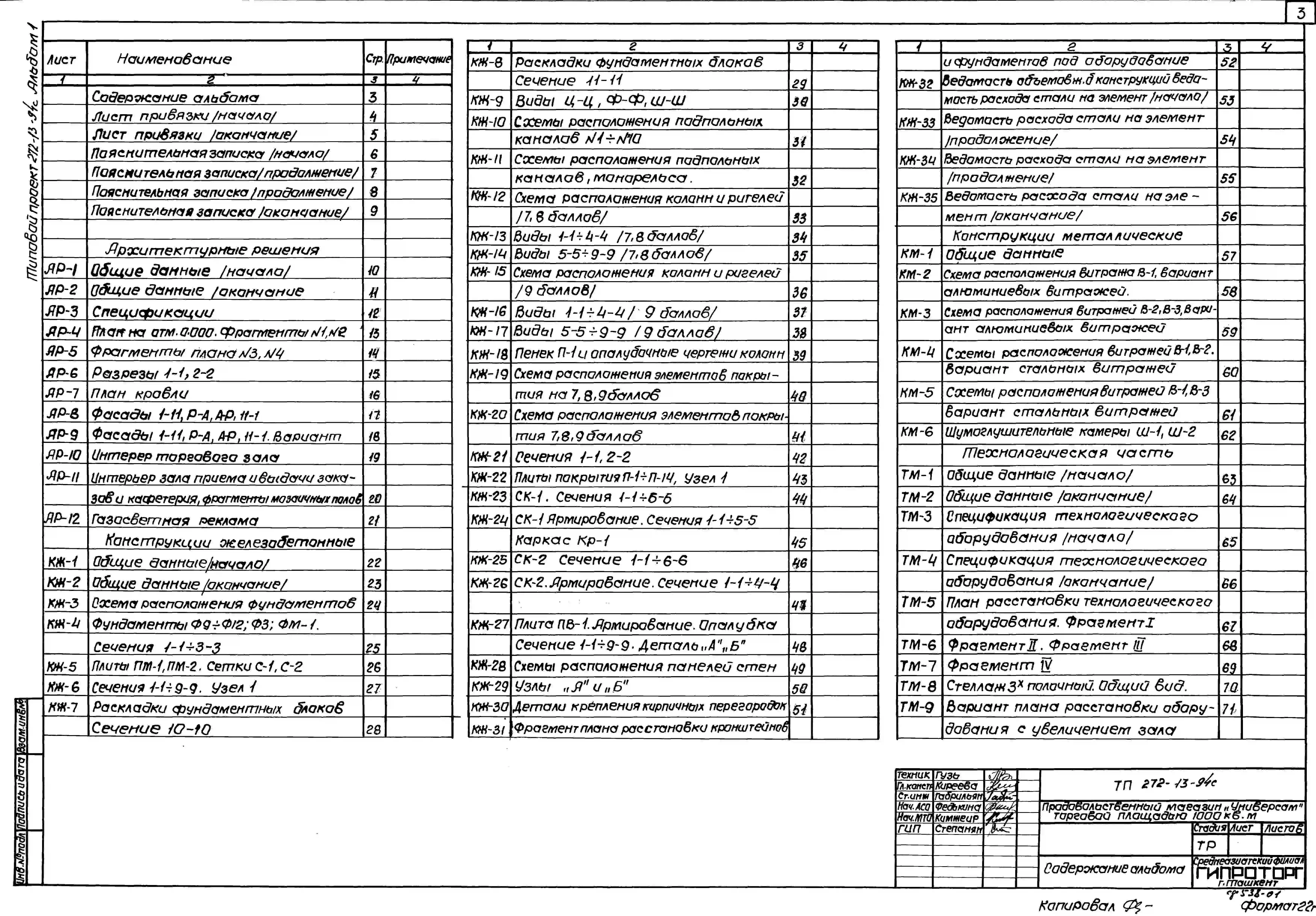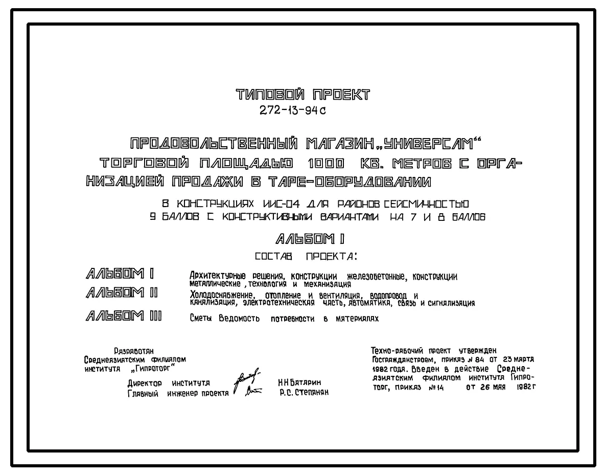 Типовой проект 272-13-94с Продовольственный магазин «Универсам» торговой площадью 1000 м2 с организацией продажи в таре-оборудования. Для строительства в 4 климатическом районе сейсмичностью 7, 8 и 9 баллов
