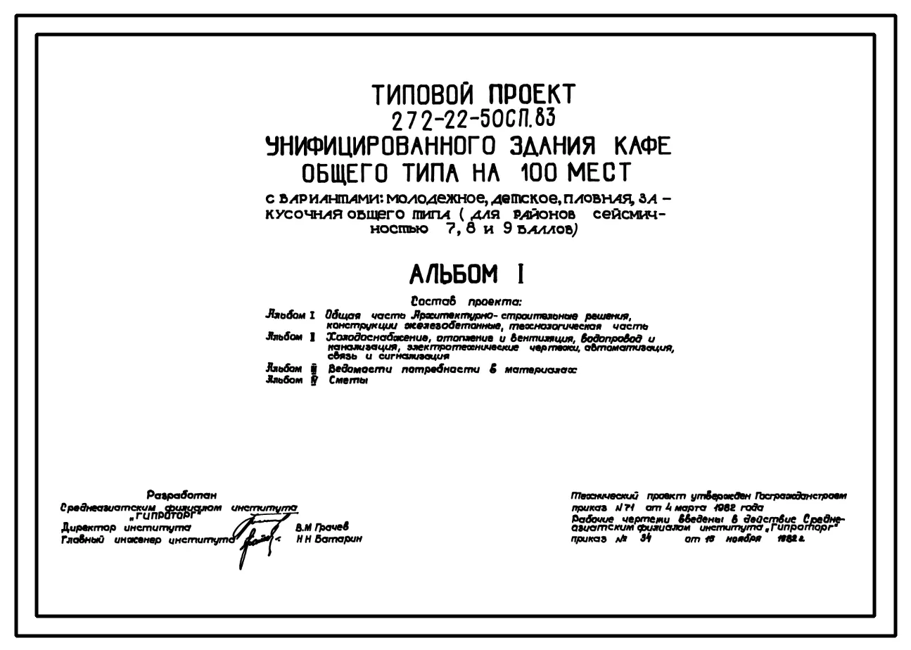 Типовой проект 272-22-50сп.83 Унифицированное здание кафе общего типа на 100 мест с вариантами: молодежное, детское, пловная, закусочная общего типа. Для строительства в 4 климатическом районе сейсмичностью 7, 8 и 9 баллов на грунтах 2 типа просадочности