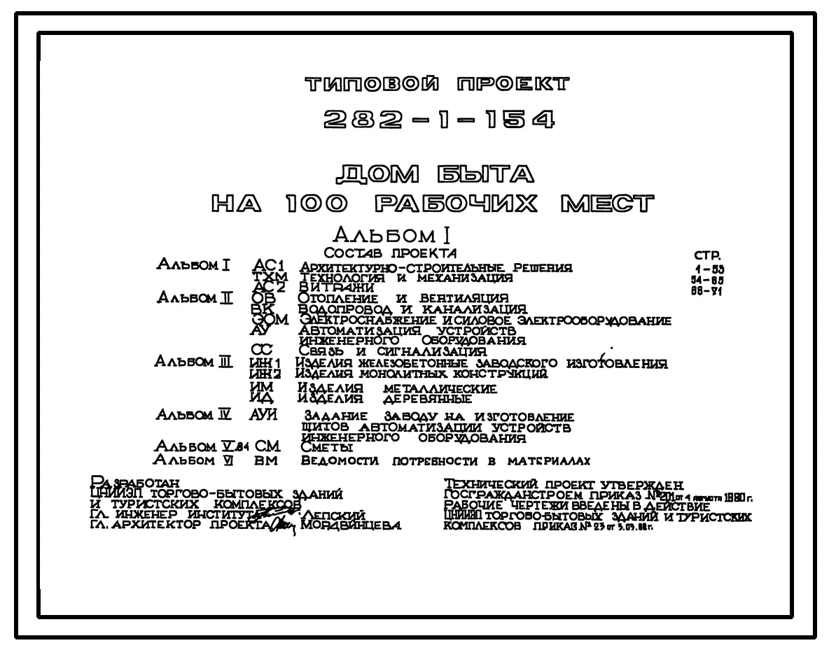 Типовой проект 282-1-154 Дом быта на 100 рабочих мест. (Проект может быть применен для выборочного строительства и для формирования торгового центра типа VIII). Здание двухэтажное. Каркас сборный железобетонный серии 1.020-1. Стены из легкобетонных панеле