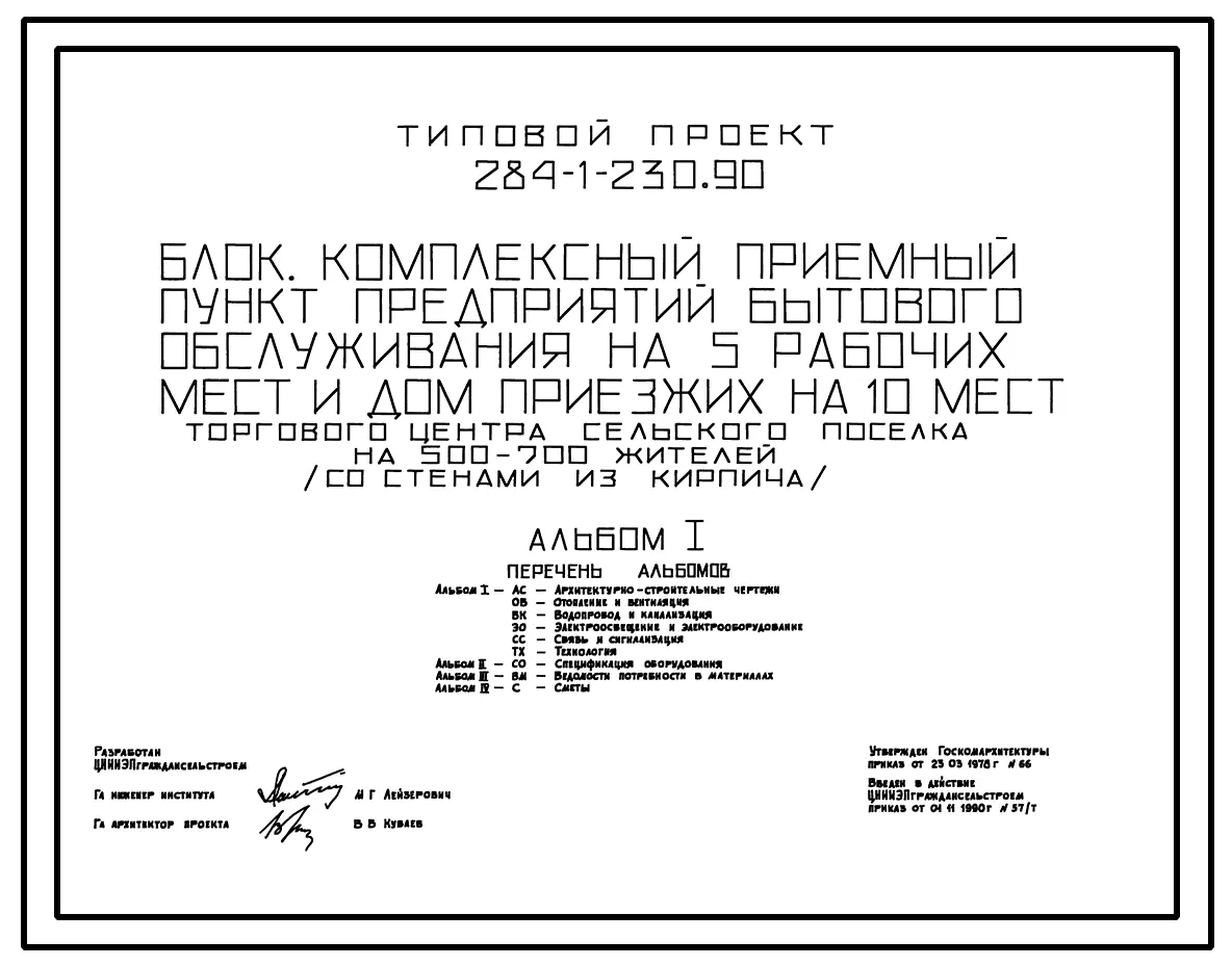 Типовой проект 284-1-230.90 Комплексный приемный пункт бытового обслуживания на 5 рабочих мест, и дом приезжих на 10 мест торгового центра сельского поселка на 500-700 жителей. Здание одноэтажное. Стены из кирпича.