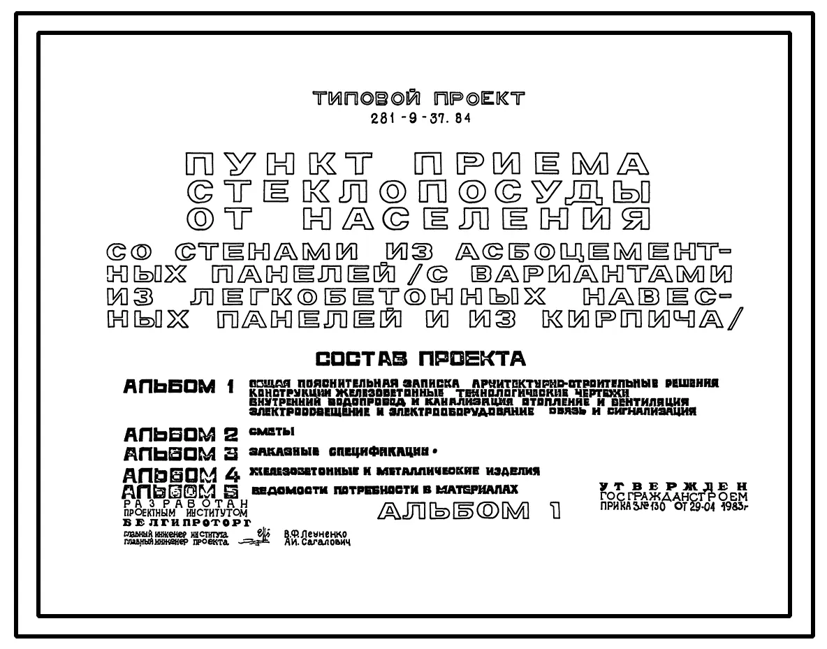 Типовой проект 281-9-37.84 Пункт приема стеклопосуды от населения (со стенами из асбестоцементных панелей).