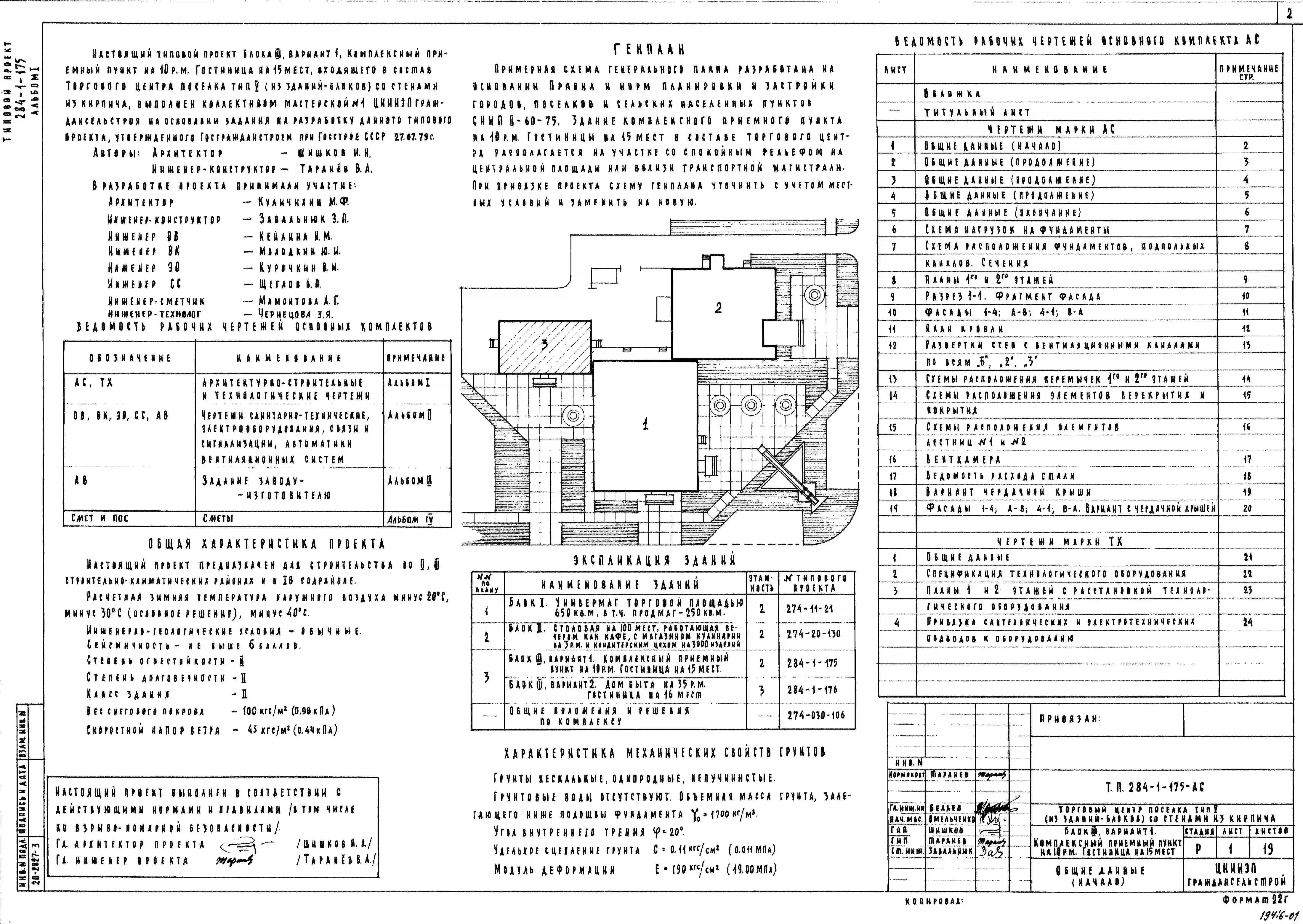 Типовой проект 284-1-175 Комплексный приемный пункт на 10 рабочих мест, гостиница на 15 мест. Для строительства в 1В климатическом подрайоне, 2 и 3 климатических районах.