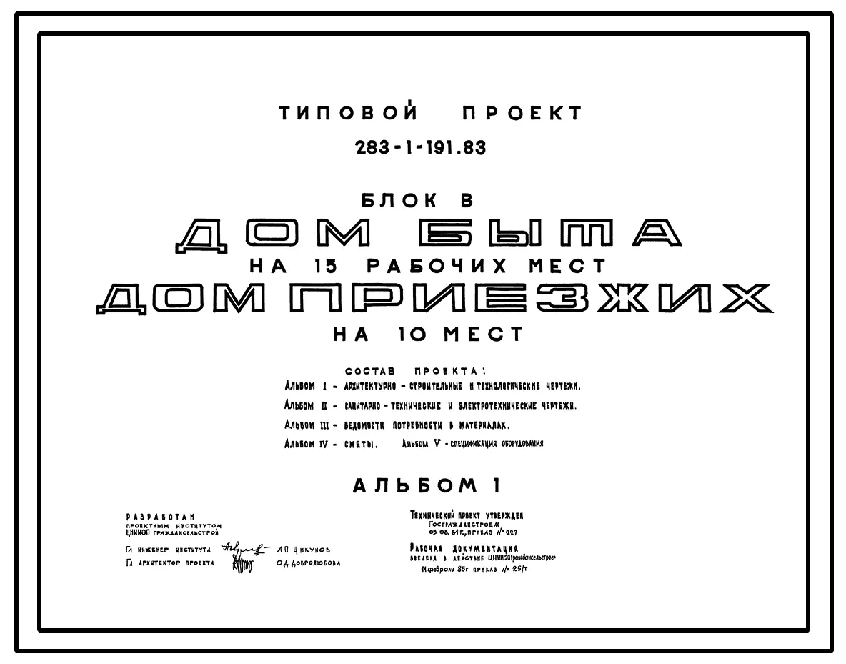 Типовой проект 283-1-191.83 Дом быта на 15 рабочих мест, дом приезжих на 10 мест. Торговый центр сельского поселка. Для строительства в 1В климатическом подрайоне, 2 и 3 климатических районах.