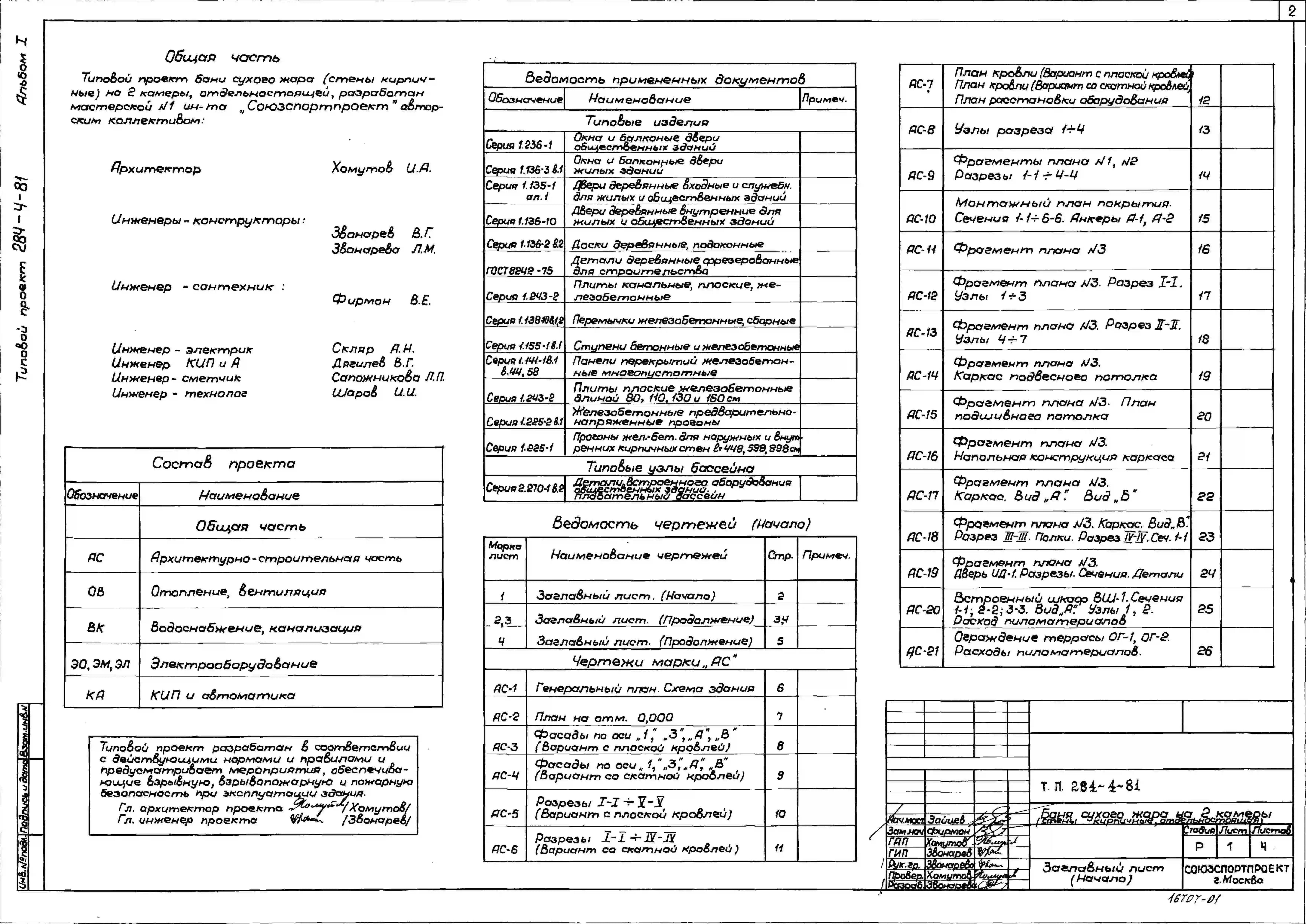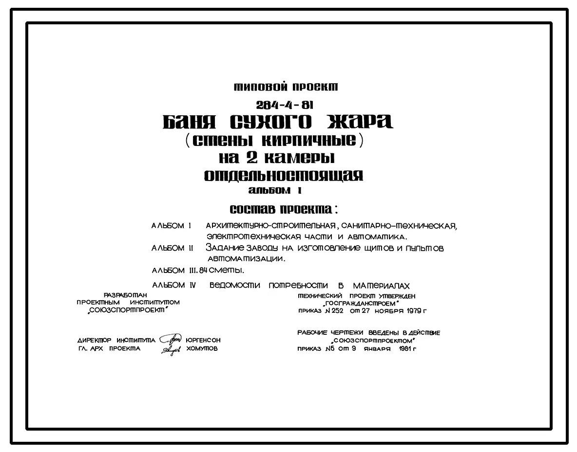 Типовой проект 284-4-81 Баня сухого жара на 2 камеры отдельно стоящая. Здание одноэтажное. Стены из кирпича.