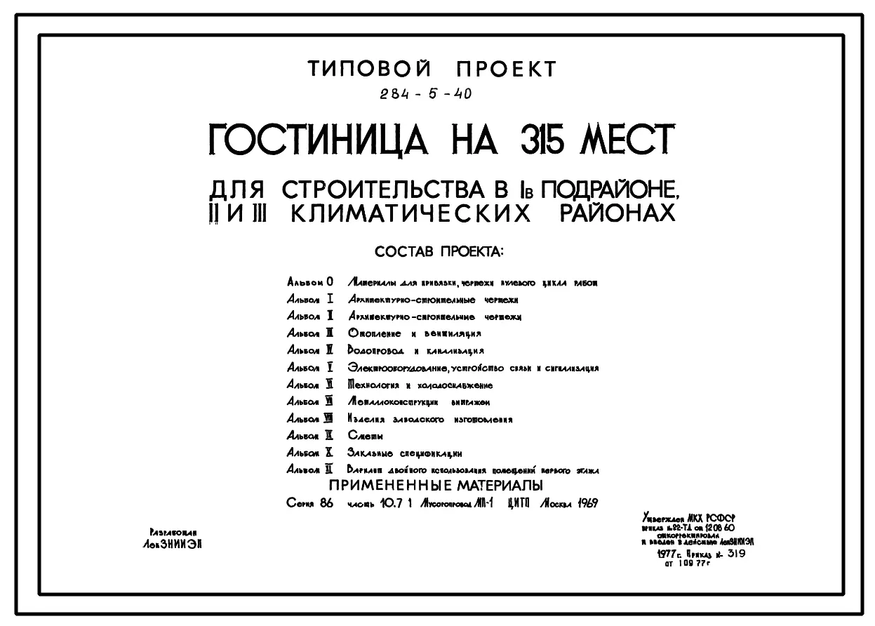 Типовой проект 284-5-40 Гостиница на 315 мест для строительства в 1В климатическом подрайоне, 2 и 3 климатических районах